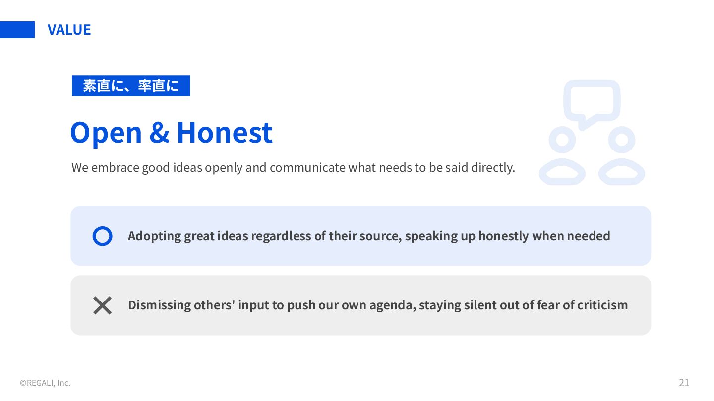 what needs to be said directly. Adopting great ideas regardless of their source, speaking up honestly when needed Open & Honest 素直に、率直に 21 Dismissing others' input to push our own agenda, staying silent out of fear of criticism