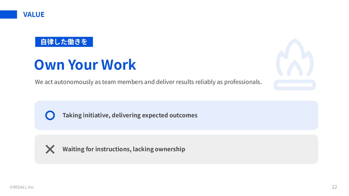 deliver results reliably as professionals. Taking initiative, delivering expected outcomes Own Your Work ⾃律した働きを 22 Waiting for instructions, lacking ownership