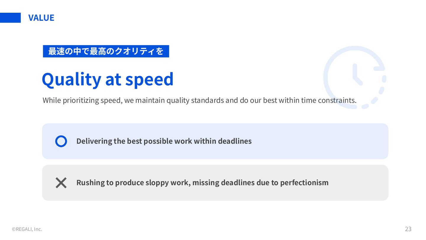 and do our best within time constraints. Delivering the best possible work within deadlines Quality at speed 最速の中で最⾼のクオリティを 23 Rushing to produce sloppy work, missing deadlines due to perfectionism