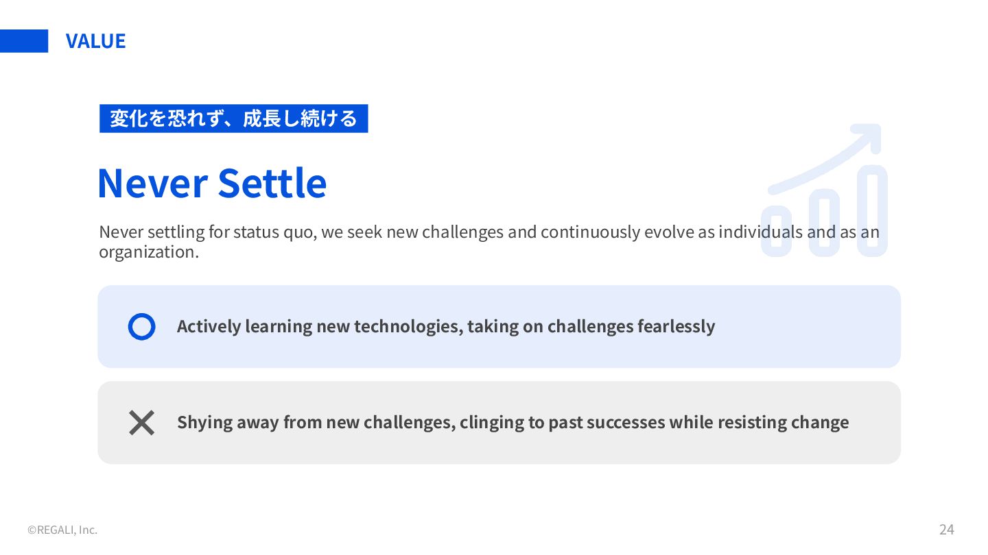 new challenges and continuously evolve as individuals and as an organization. Actively learning new technologies, taking on challenges fearlessly Never Settle 変化を恐れず、成⻑し続ける 24 Shying away from new challenges, clinging to past successes while resisting change