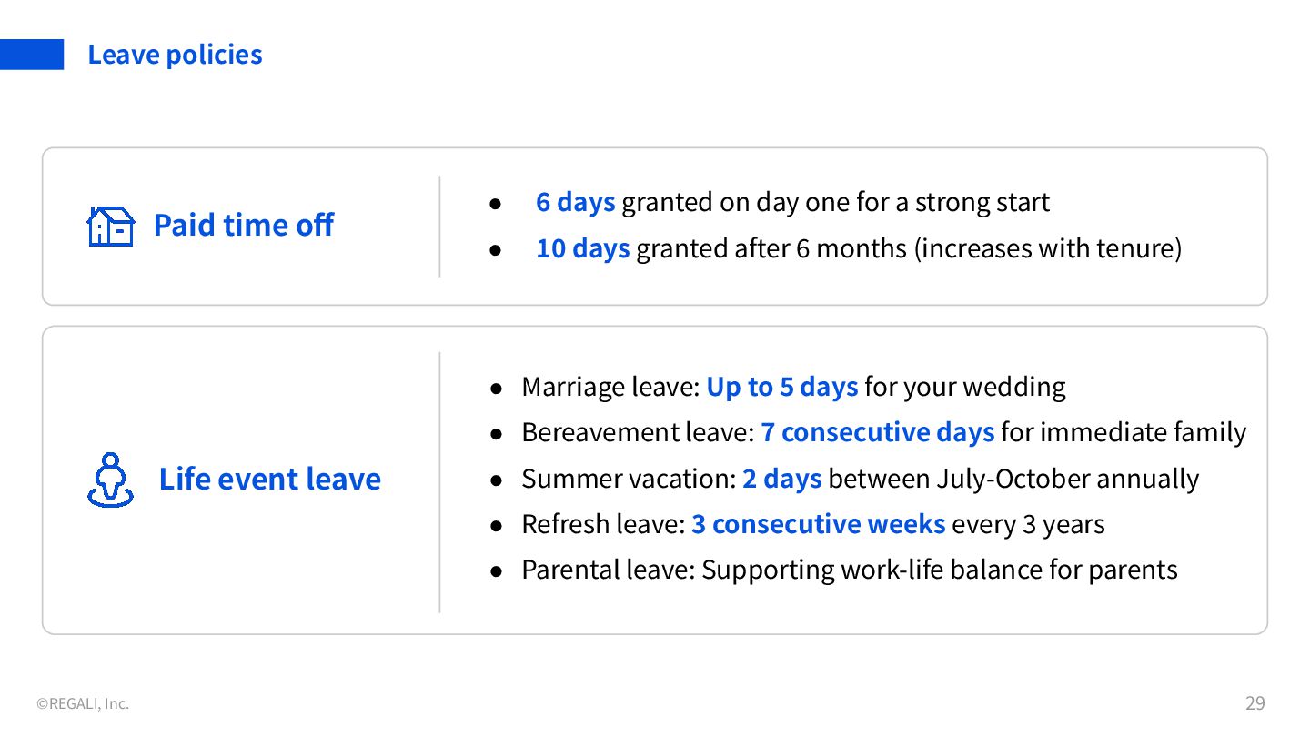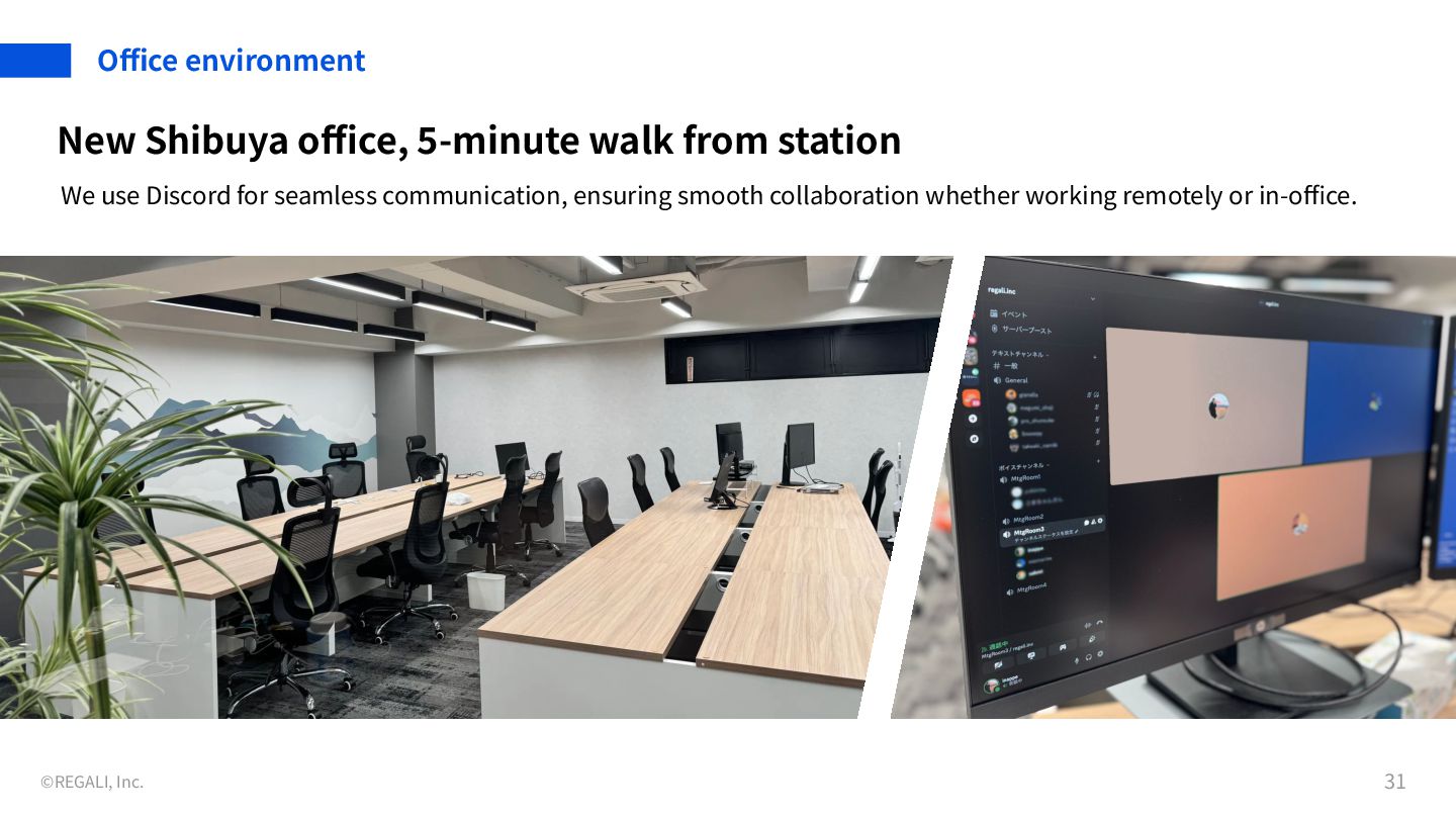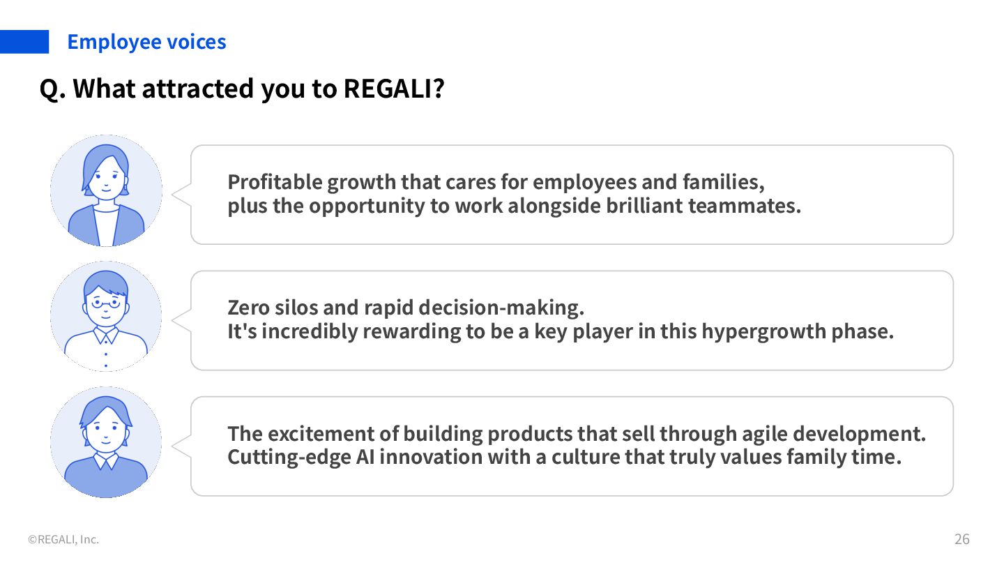 team members come from? Most come from IT and SaaS backgrounds. We have talented people across all functions from product development to sales and customer success. Q Can I join from a different industry? Of course. We value learning mindset and alignment with REGALI's values over industry experience. We provide onboarding support to help you succeed. Q Can remote workers stay connected with the team? Discord keeps us connected like we're in the same office. Multiple rooms allow both group discussions and private conversations. Q Can I balance childcare with work? Absolutely. Remote work and flexible hours enable adaptable schedules. Many parents thrive here, with flexibility for school runs and sudden childcare needs. Q How is compensation determined? We consider previous salary, skills, experience, and role responsibilities holistically. Our clear evaluation system provides growth-based salary increases. Q What are the top reasons people join REGALI? "Growth potential," "high autonomy," and "flexible work style" are the main draws. People love combining startup challenges with work-life balance. Q