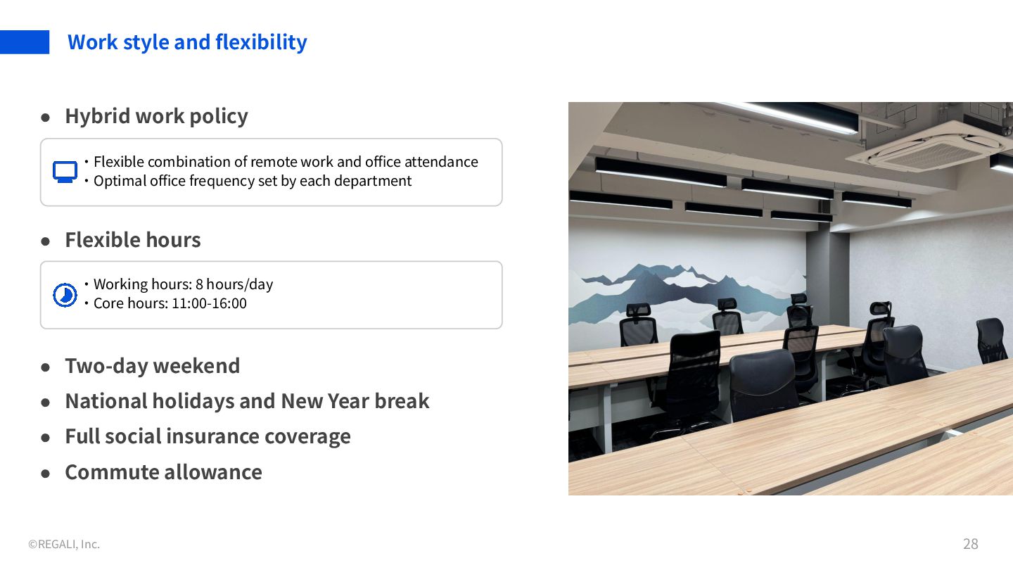 • National holidays and New Year break • Full social insurance coverage • Commute allowance ‧Flexible combination of remote work and office attendance ‧Optimal office frequency set by each department ‧Working hours: 8 hours/day ‧Core hours: 11:00-16:00 • Hybrid work policy • Flexible hours