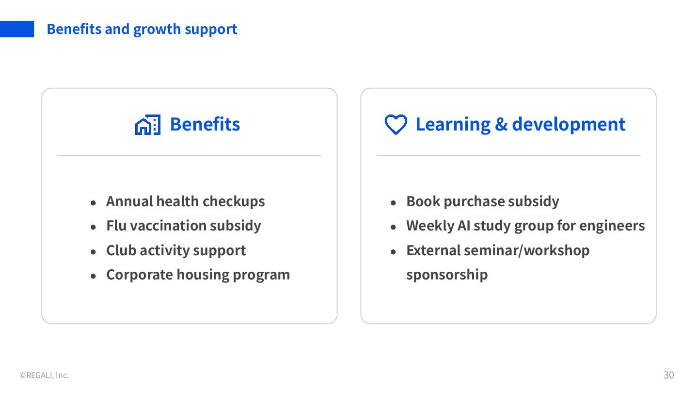 subsidy • Weekly AI study group for engineers • External seminar/workshop sponsorship • Annual health checkups • Flu vaccination subsidy • Club activity support • Corporate housing program Benefits Learning & development