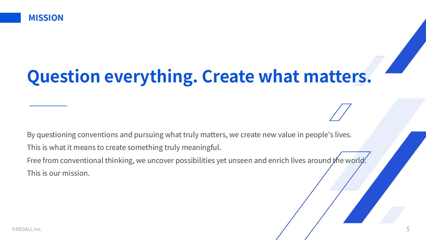 and pursuing what truly matters, we create new value in people's lives. This is what it means to create something truly meaningful. Free from conventional thinking, we uncover possibilities yet unseen and enrich lives around the world. This is our mission. MISSION 5