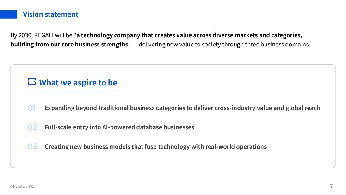 "a technology company that creates value across diverse markets and categories, building from our core business strengths" — delivering new value to society through three business domains. What we aspire to be Expanding beyond traditional business categories to deliver cross-industry value and global reach Full-scale entry into AI-powered database businesses Creating new business models that fuse technology with real-world operations 01 02 03