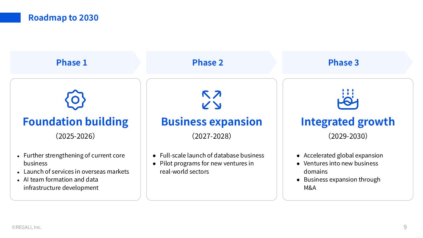 Further strengthening of current core business • Launch of services in overseas markets • AI team formation and data infrastructure development Phase 1 Phase 2 Phase 3 Business expansion (2027-2028) Integrated growth (2029-2030) • Full-scale launch of database business • Pilot programs for new ventures in real-world sectors • Accelerated global expansion • Ventures into new business domains • Business expansion through M&A