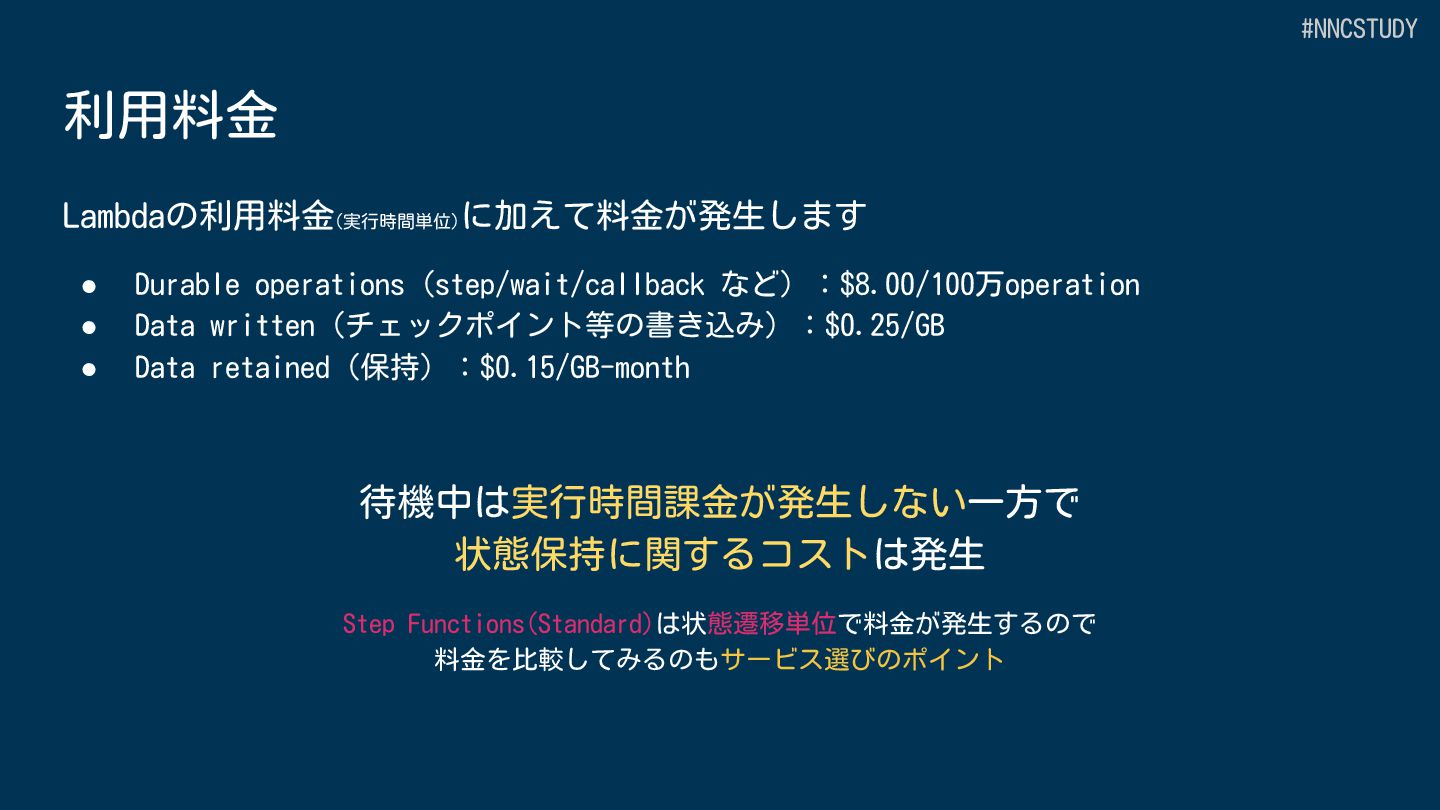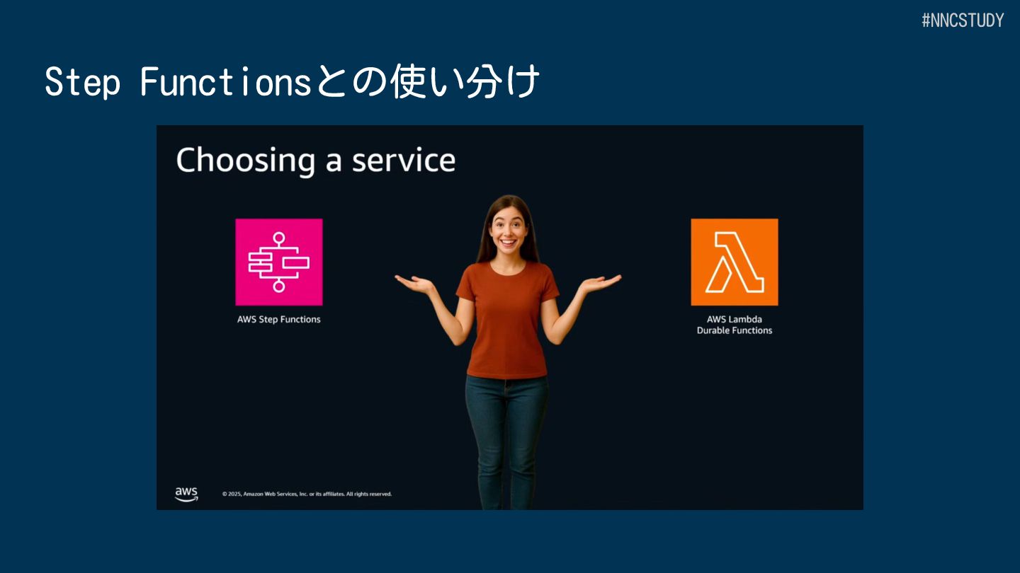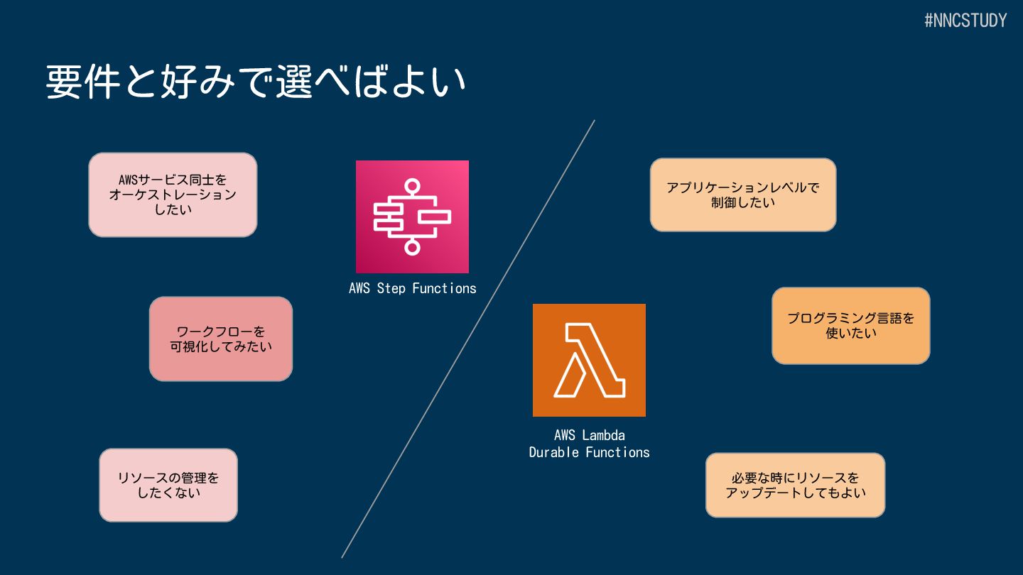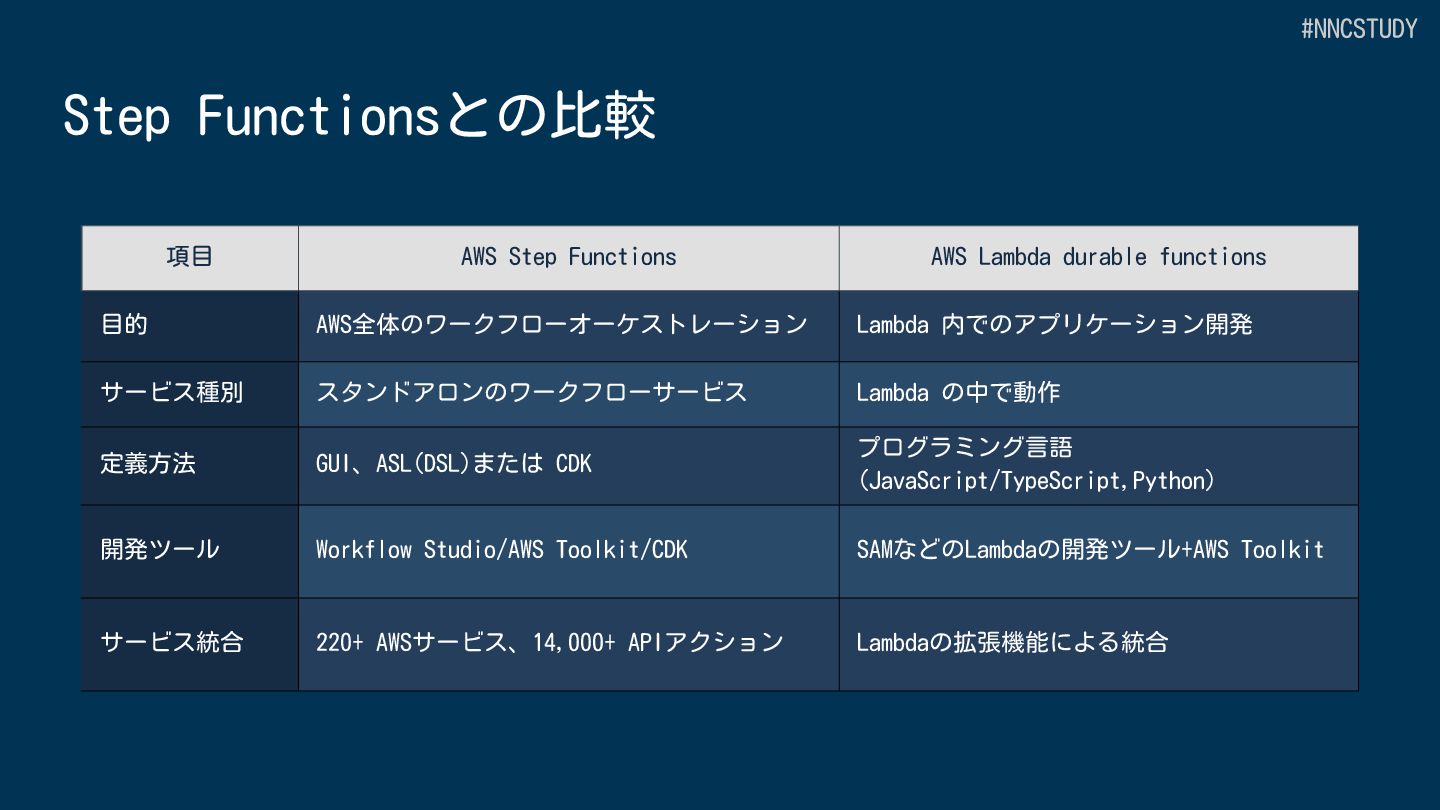 目的 AWS全体のワークフローオーケストレーション Lambda 内でのアプリケーション開発 サービス種別 スタンドアロンのワークフローサービス Lambda の中で動作 定義方法 GUI、ASL(DSL)または CDK プログラミング言語 (JavaScript/TypeScript,Python) 開発ツール Workflow Studio/AWS Toolkit/CDK SAMなどのLambdaの開発ツール+AWS Toolkit サービス統合 220+ AWSサービス、14,000+ APIアクション Lambdaの拡張機能による統合 #NNCSTUDY