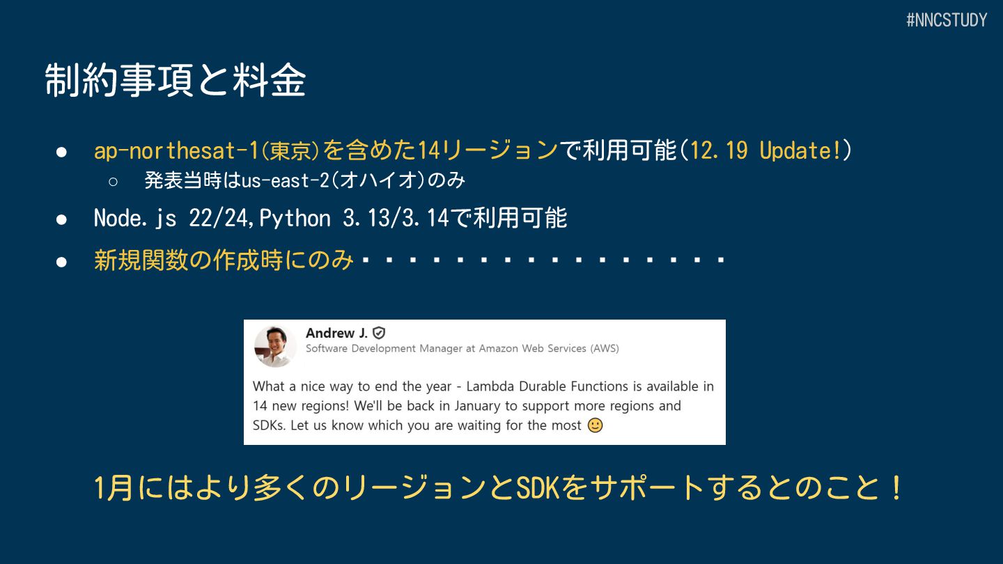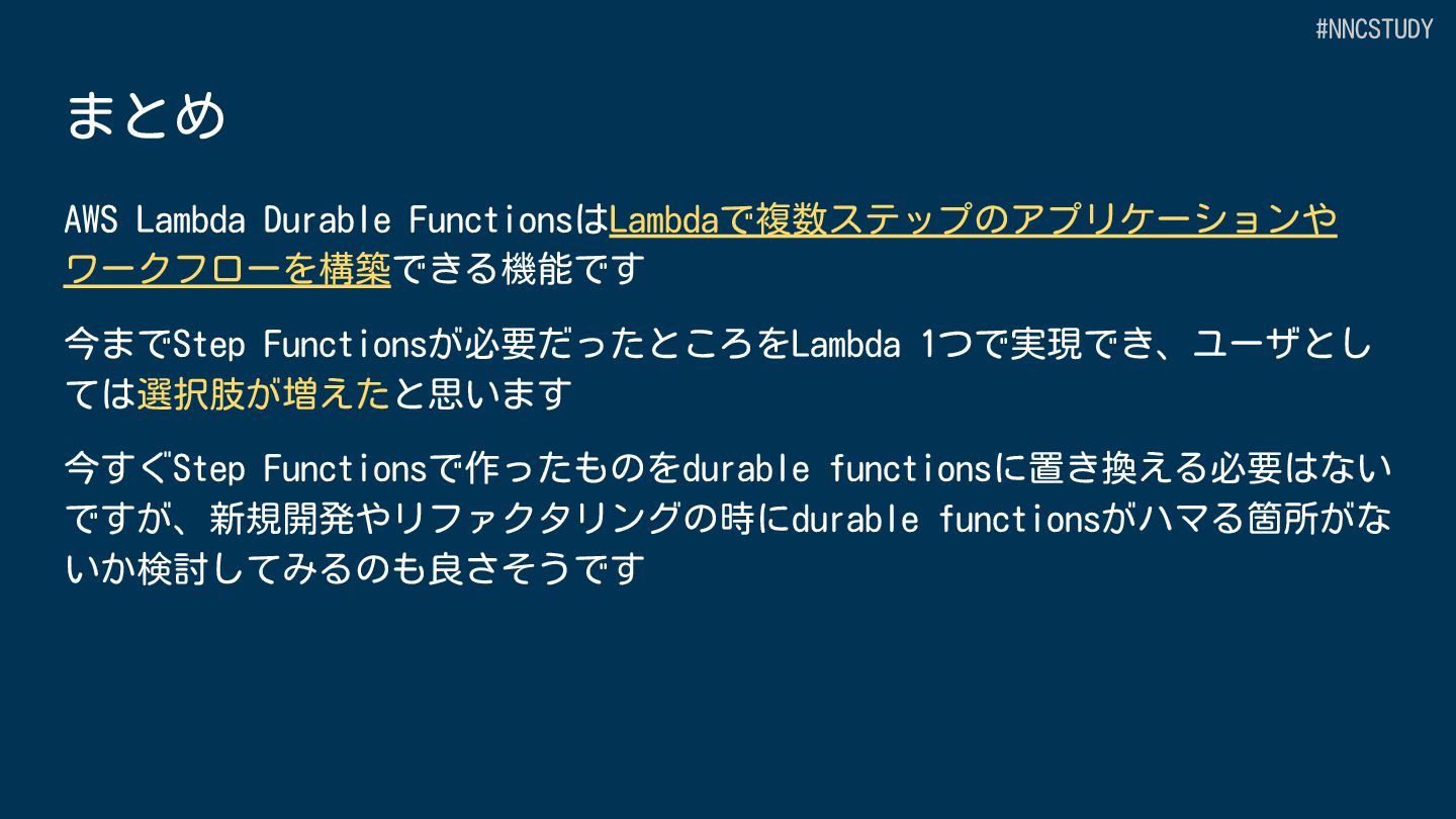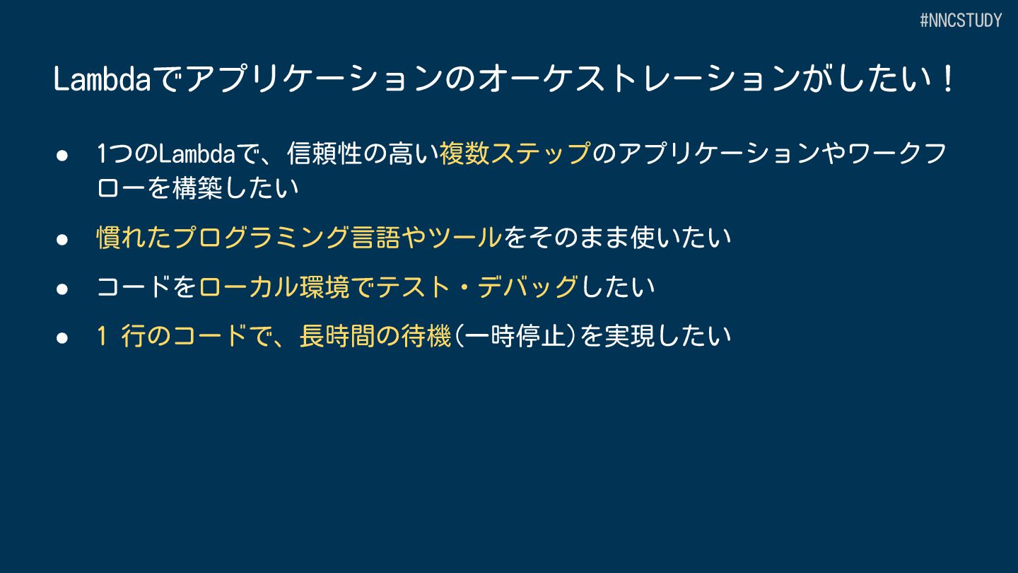 目的 AWS全体のワークフローオーケストレーション Lambda 内でのアプリケーション開発 サービス種別 スタンドアロンのワークフローサービス Lambda の中で動作 定義方法 GUI、ASL(DSL)または CDK プログラミング言語 (JavaScript/TypeScript,Python) 開発ツール Workflow Studio/AWS Toolkit/CDK SAMなどのLambdaの開発ツール+AWS Toolkit サービス統合 220+ AWSサービス、14,000+ APIアクション Lambdaの拡張機能による統合 #NNCSTUDY