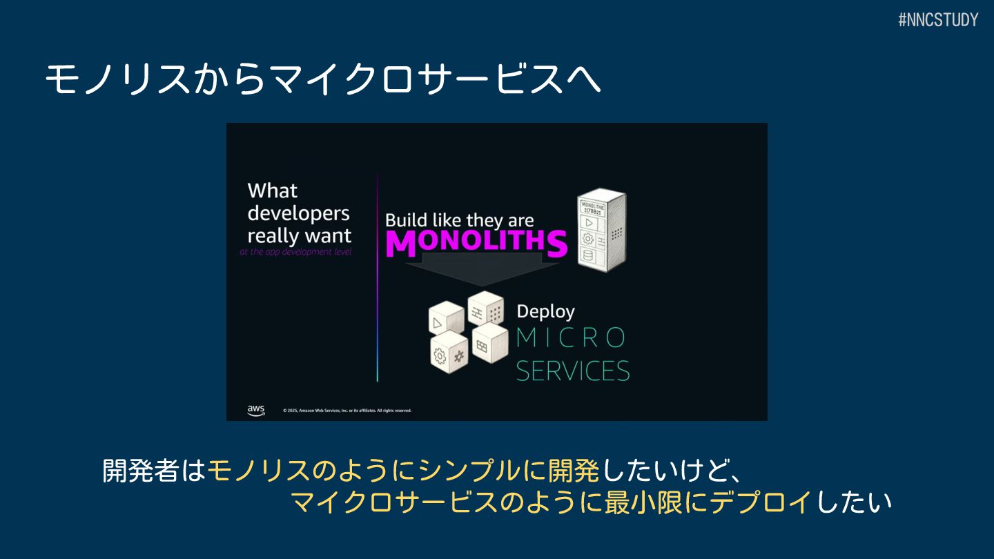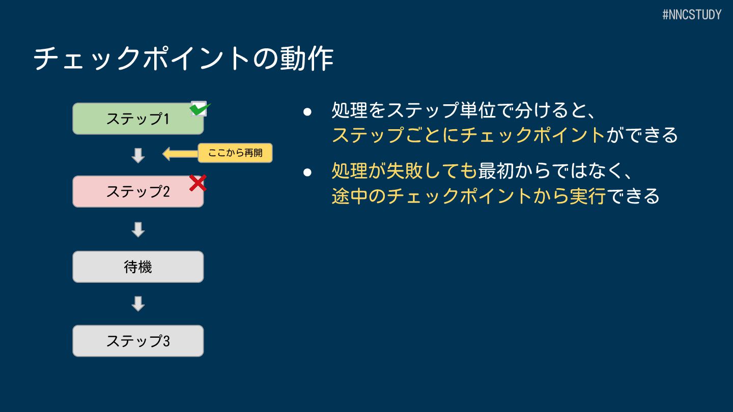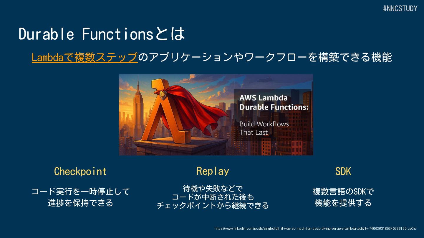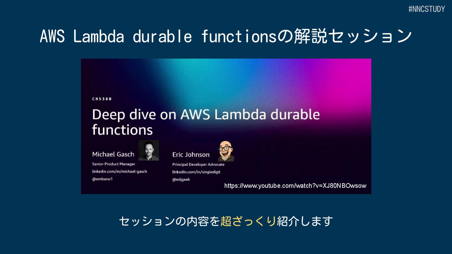 目的 AWS全体のワークフローオーケストレーション Lambda 内でのアプリケーション開発 サービス種別 スタンドアロンのワークフローサービス Lambda の中で動作 定義方法 GUI、ASL(DSL)または CDK プログラミング言語 (JavaScript/TypeScript,Python) 開発ツール Workflow Studio/AWS Toolkit/CDK SAMなどのLambdaの開発ツール+AWS Toolkit サービス統合 220+ AWSサービス、14,000+ APIアクション Lambdaの拡張機能による統合 #NNCSTUDY