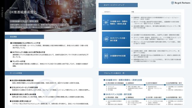 定までを伴走支援 01 全社横断でのDX推進体制を整理し、各部門との連携・調整体制を構築 ガバナンス体制(委員会、意思決定ルール、リスク管理プロセス)とコ ミュニケーション基盤(説明責任・情報共有ルール)を設計 実行フェーズにおける各所調整や説明活動を実務レベルで支援し、推進 の“詰まり”を解消 01 DX施策の進捗・成果・課題を定量・定性の両面でモニタリングし、改 善サイクルを確立 複数部門・関係者を巻き込んだ施策管理において、統制力と柔軟性を両 立した運営設計を支援 経験豊富なPMOプロフェッショナルが伴走し、実行力と定着力を兼ね備 えた組織内自走体制づくりを支援 MVV策定や実行施策・ロードマップの策定、関係組織との協力体制の構築など、多岐にわたる検討・計画への知 見が不足している。 ▪ DX推進組織立ち上げ時のナレッジ不足 業務理解とデジタル知識の両立が求められるDX推進において、具体的な進め方やノウハウを持つ人材が社内に不 足している。 ▪ DXプロジェクト推進における専門知見の不足 実行施策の推進や関係者との調整など、多様なタスクに対応できる実務人材が不足しており、計画通りの推進が 困難。 ▪ マンパワーの不足 ▪ DX組織 MVV・施策の精緻化・具体化支援 01.現状把握・MVV素案議論 02.施策検討 03.実行計画検討 04.各所調整準備・実行 ヒアリング 過去事例の収集 MVV議論 施策一覧の整理・検討 他組織事例の参照とR&Rの 明確化 各所調整に向けた具体策の 展開 資料作成・説明会実施など 推進体制の設計 役割分担・スケジュール 策定 01.現状把握・調査 02.課題抽出 03.対応策・仕組み検討 04.各所調整準備・実行 全社のDX施策状況把握の 実施 調査計画の立案と調査実施 あるべき姿の明確化 あるべき姿とのGap を具 体レベルで抽出 各所調整に向けた具体策の 展開 資料作成・説明会実施など ガバナンスを利かせた仕組 み検討・体制検討 実現計画も合わせ検討 ▪ DXガバナンス企画・実行支援 IT & Digital カテゴリー 内容 役割と責務を明確化したCoE型のDX組織を構築。外部に依存せず、自走できる体制への移行を支援。 ▪ 自立型DX推進組織の構築支援 制度設計から運営までを実行しながら伴走。立上フェーズで推進メンバーとして関与することで、内製化を後押し。 ▪ 立ち上げメンバーとしての実行支援 業界出身でDXに精通した人材が参画。業務とデジタルの両面から現場の課題に即した実践的な支援を実施。 ▪ 業務知見を備えた専門人材の配置 リテラシー向上プログラムやコミュニティ連携を通じて、変革の担い手を増やし、全社レベルでのDX推進を加速。 ▪ 全社浸透と変革力の底上げ 多様な業界における支援実績を踏まえ、戦略立案や組織設計にとどまらず、 現場の実務課題や悩みにまで踏み込んだ実行支援を提供します。 DX推進組織の立ち上げ・加速を実現 01 02 03 IT & Digital DX推進組織高度化
