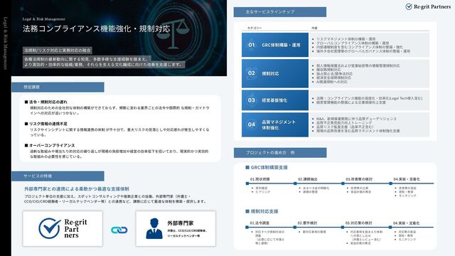 資料確認 ヒアリング あるべき姿の明確化 課題の整理 改善策の実装 周知・教育 モニタリング 改善策の立案 実装計画の策定 外部専門家 弁護士、CCO/CLO/CRO経験者、 リーガルテックベンダー等 01.法令調査 02.要件検討 03.対応策の検討 04.実装・定着化 対応すべき規制内容の 調査 (必要に応じて弁護士 等と連携) 要対応事項の整理 対応策の実装 周知・教育 モニタリング 対応事項を踏まえた体制 への落とし込み (弁護士レビュー含む) 実装計画の策定 ▪ 規制対応支援 規制対応のための全社的な体制の構築ができておらず、頻繁に変わる業界ごとの法令や国際的 な規制・ガイドラ インへの対応が追いつかない 。 ▪ 法令・規制対応の遅れ リスクやインシデントに関する情報連携の体制 が不十分で、重大リスクの見落としや対応遅れが発生しやすくな っている。 ▪ リスク情報の連携不足 過剰な取組みや場当たり的対応の繰り返しが現場の負担増加や経営の効率低下を招いており、現実的かつ実効的 な取組みの必要性を感じている。 ▪ オーバーコンプライアンス 法務コンプライアンス機能強化・規制対応 Legal & Risk Management 各種法規制の最新動向に関する知見、 多数多様な支援経験を踏まえ、 より実効的・効率的な組織/業務、それらを支える 文化醸成に向けた改善を支援します。 プロジェクト単位の支援に加え、スポットコンサルティングや複数企業との協働、外部専門家(弁護士・ CCO/CIO/CRO経験者・リーガルテックベンダー等)との連携など、課題に応じて最適な体制を構築・提供します。 法規制/リスク対応と実務対応の融合 Legal & Risk Management 外部専門家との連携による柔軟かつ最適な支援体制 リスクマネジメント体制の構築・運用 グローバルコンプライアンス体制の構築・運用 内部通報制度を含むコンプライアンス体制の整備・強化 海外子会社管理等のグローバルガバナンス体制の整備・運用 01 個人情報保護法および営業秘密等の情報管理規制対応 贈収賄規制対応 独占禁止法/競争法対応 経済安全保障規制対応 AI関連規制への対応 02 法務・コンプライアンス機能の高度化・効率化(Legal Tech導入含む) 経営管理機能の整備による企業価値向上支援 03 M&A、新規事業開発に伴う品質デューデリジェンス 品質不正発見能力向上トレーニング 品質リスク監査支援(品率不正含む) 現場の品質改善を含む品質マネジメント体制強化支援 04 カテゴリー 内容