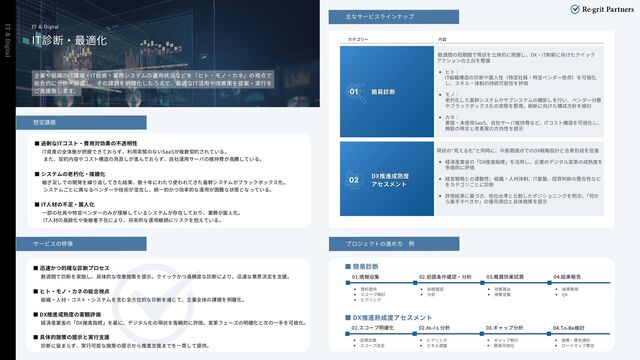 モノ: 老朽化した基幹システムやサブシステムの棚卸しを行い、ベンダー分散 やブラックボックス化の実態を整理。刷新に向けた構成方針を検討 カネ: 重複・未使用SaaS、自社サーバ維持費など、ITコスト構造を可視化し、 無駄の特定と改善案の方向性を提示 現状の“見える化”と同時に、中長期視点でのDX戦略設計と合意形成を促進 経済産業省の「DX推進指標」を活用し、企業のデジタル変革の成熟度を 多面的に評価 経営戦略との連動性、組織・人材体制、IT基盤、投資判断の整合性など をカテゴリごとに診断 評価結果に基づき、他社水準と比較したポジショニングを明示。 「何か ら着手すべきか」の優先順位と具体施策を提示 IT資産の全体像が把握できておらず、利用実態のないSaaSが複数契約されている。 また、契約内容やコスト構造の見直しが進んでおらず、自社運用サーバの維持費が高騰している。 ▪ 過剰なITコスト・費用対効果の不透明性 継ぎ足しでの開発を繰り返してきた結果、数十年にわたり使われてきた基幹システムがブラックボックス化。 システムごとに異なるベンダーや技術が混在し、統一的かつ効率的な運用が困難な状態となっている。 ▪ システムの老朽化・複雑化 一部の社員や特定ベンダーのみが理解しているシステムが存在しており、業務が属人化。 IT人材の高齢化や後継者不在により、将来的な運用継続にリスクを抱えている。 ▪ IT人材の不足・属人化 ▪ 簡易診断 01.情報収集 02.前提条件確認・分析 03.概算効果試算 04.結果報告 資料提供 スコープ検討 ヒアリング 前提確認 分析 結果報告 QA 効果算出 施策定義 01.スコープ明確化 02.As-Is分析 03.ギャップ分析 04.To-Be検討 目標定義 スコープ決定 ヒアリング スキル調査 施策・優先順位 ロードマップ策定 ギャップ明示 簡易可視化 ▪ DX推進熟成度アセスメント 企業や組織のIT環境・IT投資・業務システムの運用状況などを「ヒト・モノ・カネ」の視点で 総合的に分析・評価し、その課題を明確化したうえで、最適なIT活用や改善策を提案・実行を ご支援致します。 IT & Digital 01 02 カテゴリー 内容 数週間で診断を実施し、具体的な改善施策を提示。クイックかつ高精度な診断により、迅速な意思決定を支援。 ▪ 迅速かつ的確な診断プロセス 組織・人材・コスト・システムを含む全方位的な診断を通じて、企業全体の課題を明確化。 ▪ ヒト・モノ・カネの総合視点 経済産業省の「DX推進指標」を基に、デジタル化の現状を客観的に評価。変革フェーズの明確化と次の一手を可視化。 ▪ DX推進成熟度の客観評価 診断に留まらず、実行可能な施策の提示から推進支援までを一貫して提供。 ▪ 具体的施策の提示と実行支援 IT & Digital IT診断・最適化