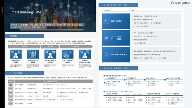 スマートビルコンセプト策定 スマートビルサービス優先順位付け 実施設計書作成支援 ベンダー選定支援 01 業務内容調査、業務量調査、削減効果の高い業務の優先順位付け 運用効率化施策検討、ROI・KPI計画策定 運用ガイドライン策定、研修・トレーニング支援 計画段階 施工段階 運用段階 Others カテゴリー 内容 建築における基本構想、計画、設計、施工、運用の各フェーズにおいて、スマートビル、建設、 ICTの専門家がプロジェクトを牽引いたします 01 02 03 投資対効果が 不明瞭 建築コストのみならず竣工後のLCC を加味して、スマートビルにいくら 投資することが最適なのか 設計対応状況が 未精査 抜け漏れのない設計(適正な設備実 装・サービス受入可能仕様など)お よび責任区分をどのように見極めれ ば良いのか 検討スケジュール が不整合 施工が進んでいる中、スマートビル 検討の各種スケジュールをどのよう に調整するべきか サービス連携が 未検討 運用時を見据え、複数メーカー/ベ ンダーのシステムをどのように連携 するべきか 具体的な 運用ルール未策定 商習慣による管理規程を見直し、ス マートビルの恩恵を最大化するため には、どのようなアプローチを実施 すれば良いのか 運設工程 MSI支援業務の内容例 事例・情報収集 実現可能性調査 コンセプトデザイン ファシリテーション 運用計画の作成支援 運用マニュアルの作成支援 トレーニング計画支援 パートナーマネジメント支援 施行計画の精査 システムインテグレート 設計監理 施行図書の作成支援 予算化支援 要件定義書作成 設計事業者の選定 サービスデザイン支援 スマートビルマスタープラン策定 設計図書の作成支援 仕様グレード精査 連携仕様の整理 施工事業者の選定/コスト管理支援 開発要素の精査 顧客満足度調査 改修提案 企画 構想 計画 設計 施行 運用 改修 ▪ 事業計画策定支援プロジェクト 01.外部環境分析 02.内部環境分析 03.勝ち筋分析 04.ビジネスモデル策定 市場・消費者動向調査 競合分析 事業リスク分析 コスト・収益構造分析 事業者のケイパビリティ 組織調査 ビジネスモデル検討 サービスマネジメント 方式策定 競合分析を踏まえた KSF/KBF分析 競合優位性分析 01.コンセプト策定 02. 03.実施設計所作成支援 04.ベンダー選定支援 過去の取組み状況・中期経 営計画・担当者ヒアリング プロジェクトの全体方針策 定 競合他社分析 スマートビルサービス調査 スマートビルサービス検討 優先順位付け スマートビルサービス全体 アーキテクチャ構築 各サービスのベンダー調 査・概算費用算出 評価基準策定 設備・構造に影響する要 件・仕様反映 施行スケジュール策定 ステイクホルダータスクフ ロー作成 ▪ スマートビルサービス策定プロジェクト スマートビルサービス選定 不動産価値向上のために、ウェルビーイング、グリーン、セキュリティ、レジリエンス、省人化などの目的を達成するための手段と して、ICTを活用したスマートビルが近年注目されている中、プロジェクトを進めていく中で、フェーズ毎に課題が発生。 スマートビルは高度なシステム連携と関係者調整が不可欠。戦略・IT・建設・不動産に通じた専門人材が全工程を支援します。 Smart Buildings MSI Others