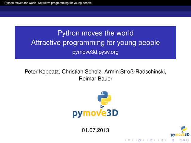 moves the world Attractive programming for young people pymove3d.pysv.org Peter Koppatz, Christian Scholz, Armin Stroß-Radschinski, Reimar Bauer 01.07.2013