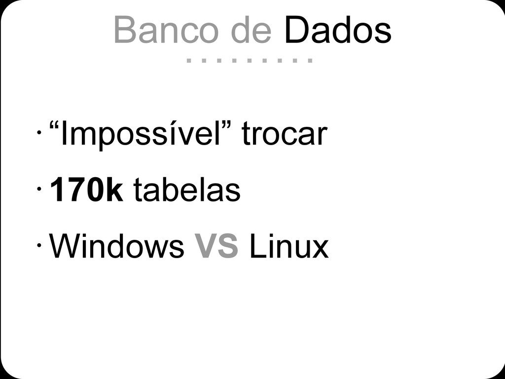 • “Impossível” trocar • 170k tabelas • Windows VS Linux