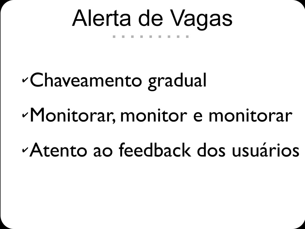 ✔ Chaveamento gradual ✔ Monitorar, monitor e monitorar ✔ Atento