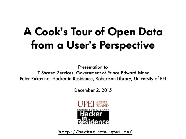 Presentation to Prince Edward Island IT Shared Services staff on December 2, 2015, looking at open data not from a policy or regulatory perspective, but through the eyes of someone who has been consuming open data, and pointing to general principles that have been learned along the way.