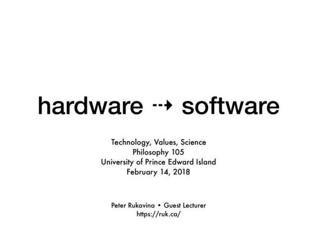 A guest lecture to University of Prince Edward Island Philosophy 105, Technology, Values & Science on the technical and cultural transition from hardware to software, February 14, 2018.