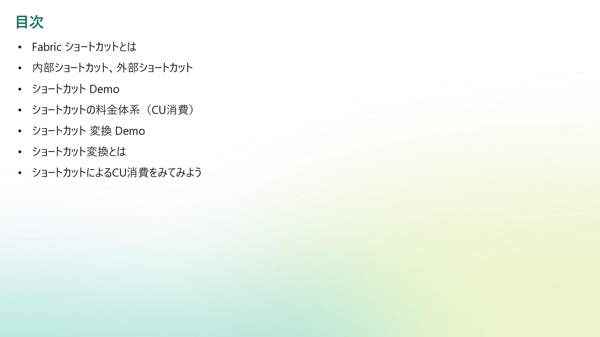 1. 目次 • Fabric ショートカットとは • 内部ショートカット、外部ショートカット • ショートカット Demo •