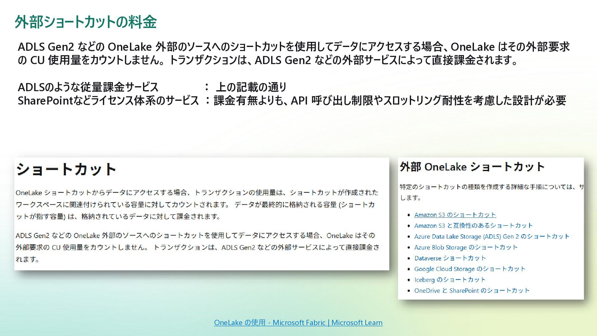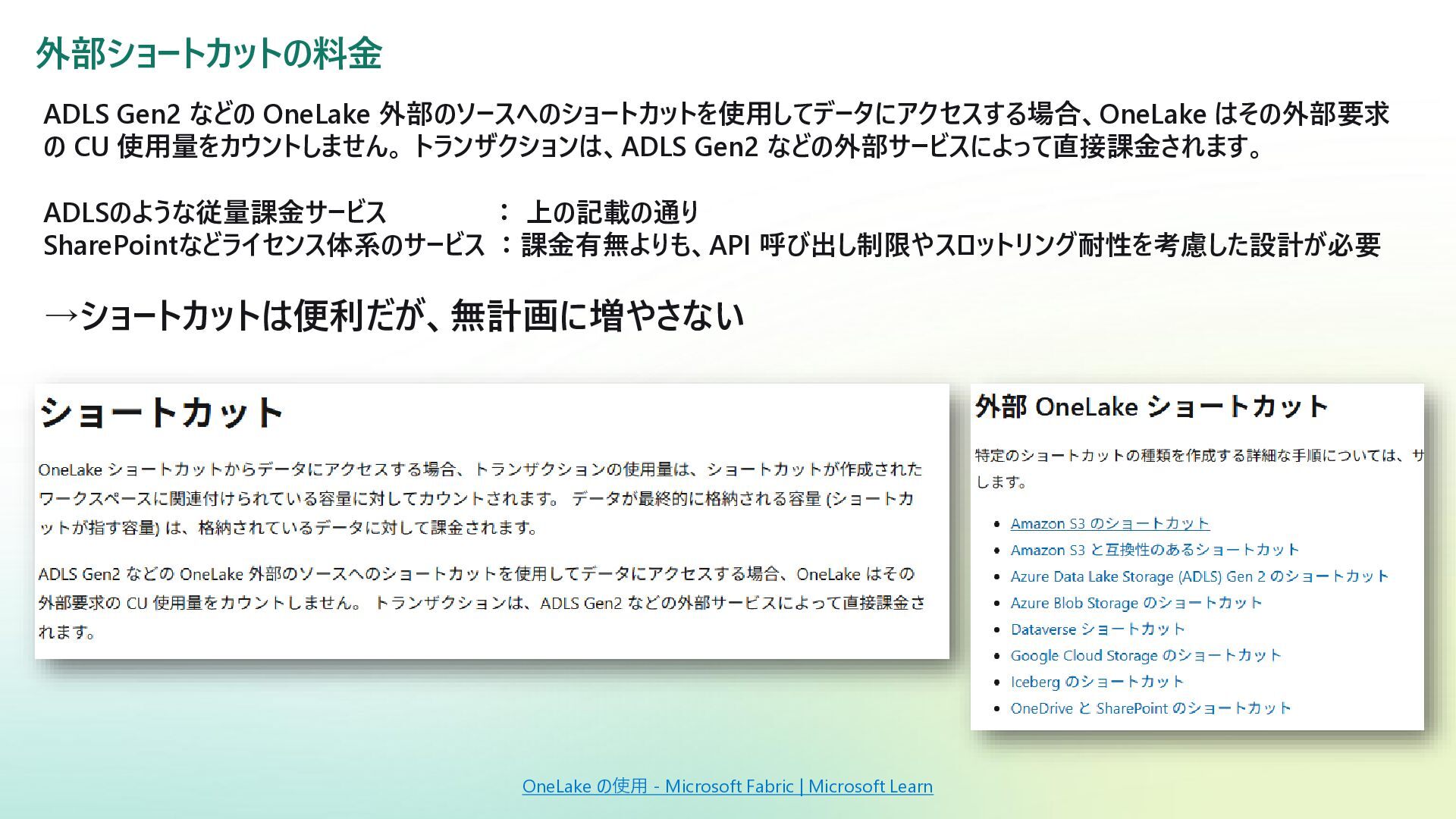 トランザクションは、ADLS Gen2 などの外部サービスによって直接課金されます。 ADLSのような従量課金サービス : 上の記載の通り SharePointなどライセンス体系のサービス :課金有無よりも、API 呼び出し制限やスロットリング耐性を考慮した設計が必要 →ショートカットは便利だが、無計画に増やさない OneLake の使用 - Microsoft Fabric | Microsoft Learn