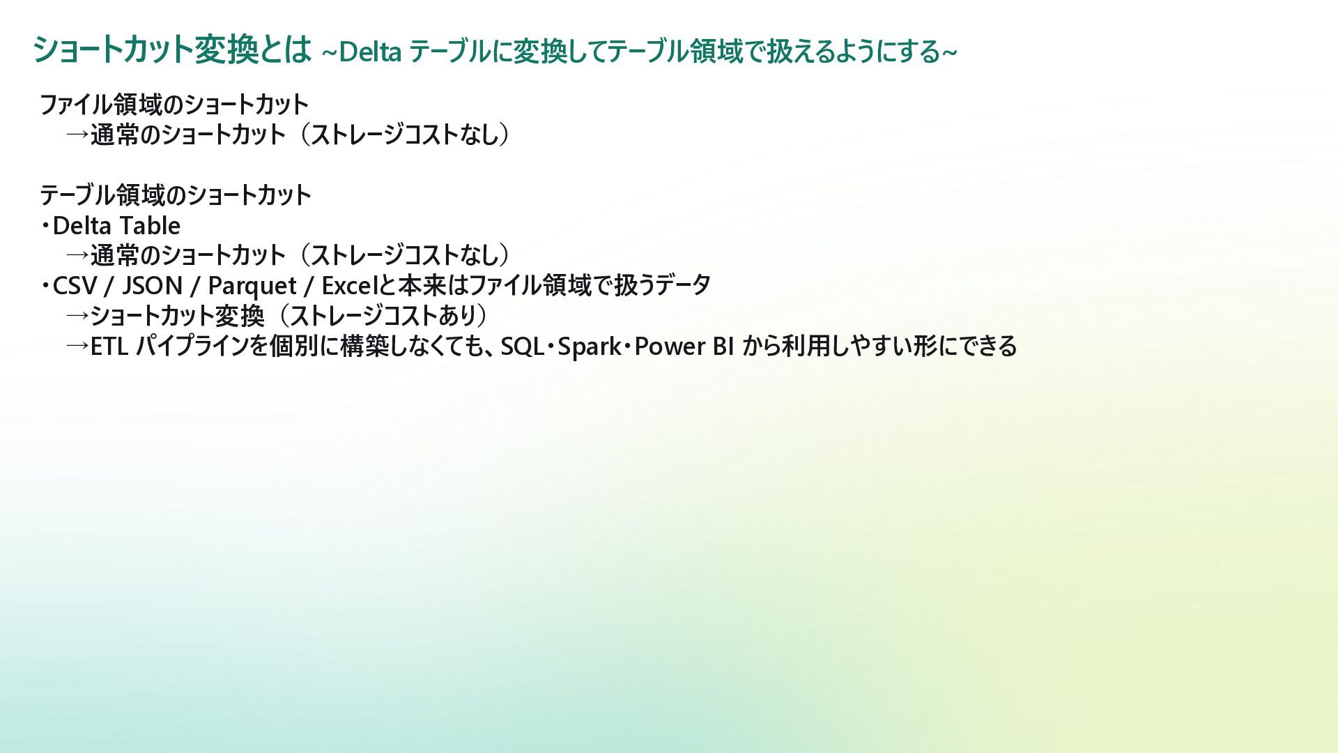 / JSON / Parquet / Excelと本来はファイル領域で扱うデータ →ショートカット変換(ストレージコストあり) →ETL パイプラインを個別に構築しなくても、SQL・Spark・Power BI から利用しやすい形にできる