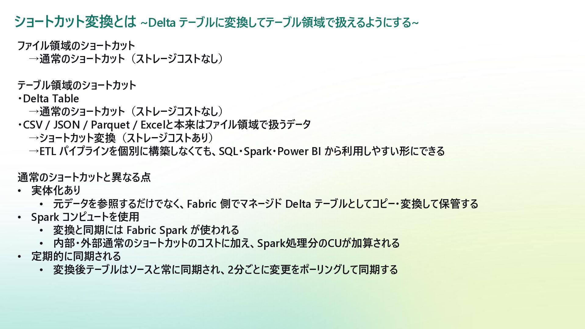 / JSON / Parquet / Excelと本来はファイル領域で扱うデータ →ショートカット変換(ストレージコストあり) →ETL パイプラインを個別に構築しなくても、SQL・Spark・Power BI から利用しやすい形にできる 通常のショートカットと異なる点 • 実体化あり • 元データを参照するだけでなく、Fabric 側でマネージド Delta テーブルとしてコピー・変換して保管する • Spark コンピュートを使用 • 変換と同期には Fabric Spark が使われる • 内部・外部通常のショートカットのコストに加え、Spark処理分のCUが加算される • 定期的に同期される • 変換後テーブルはソースと常に同期され、2分ごとに変更をポーリングして同期する