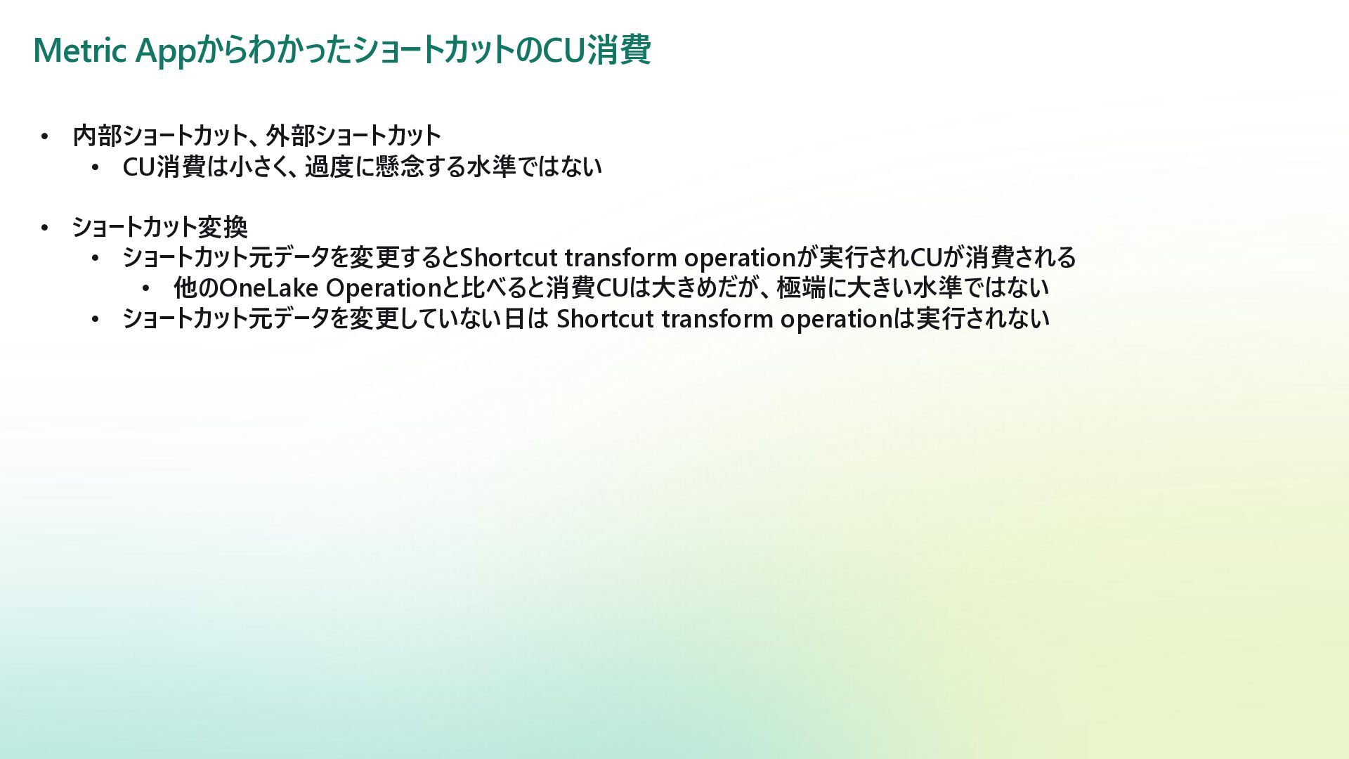 transform operationが実行されCUが消費される • 他のOneLake Operationと比べると消費CUは大きめだが、極端に大きい水準ではない • ショートカット元データを変更していない日は Shortcut transform operationは実行されない