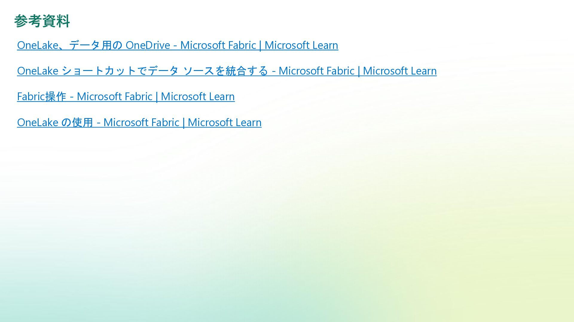 ショートカットでデータ ソースを統合する - Microsoft Fabric | Microsoft Learn Fabric操作 - Microsoft Fabric | Microsoft Learn OneLake の使用 - Microsoft Fabric | Microsoft Learn