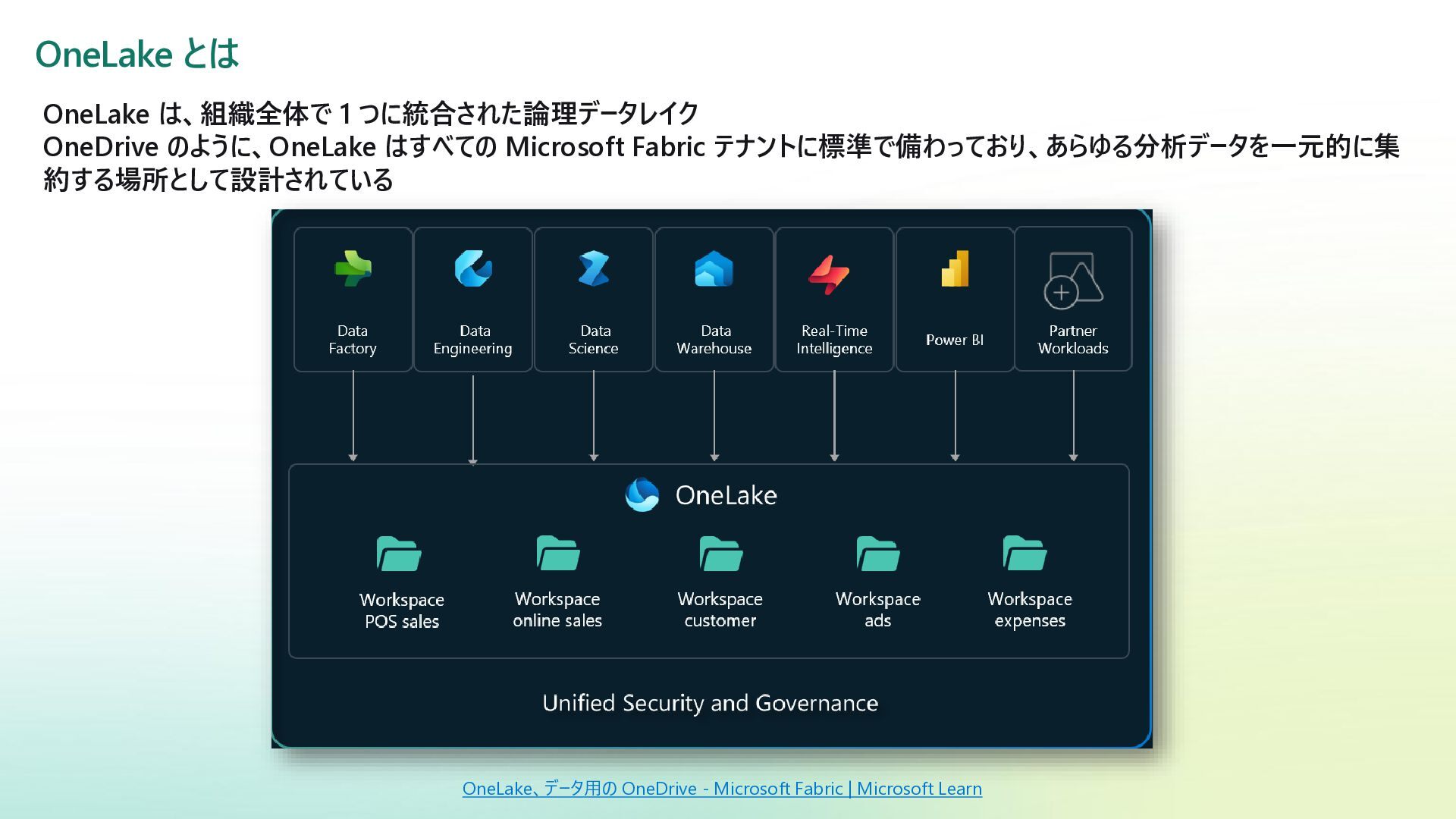 Fabric テナントに標準で備わっており、あらゆる分析データを一元的に集 約する場所として設計されている OneLake、データ用の OneDrive - Microsoft Fabric | Microsoft Learn