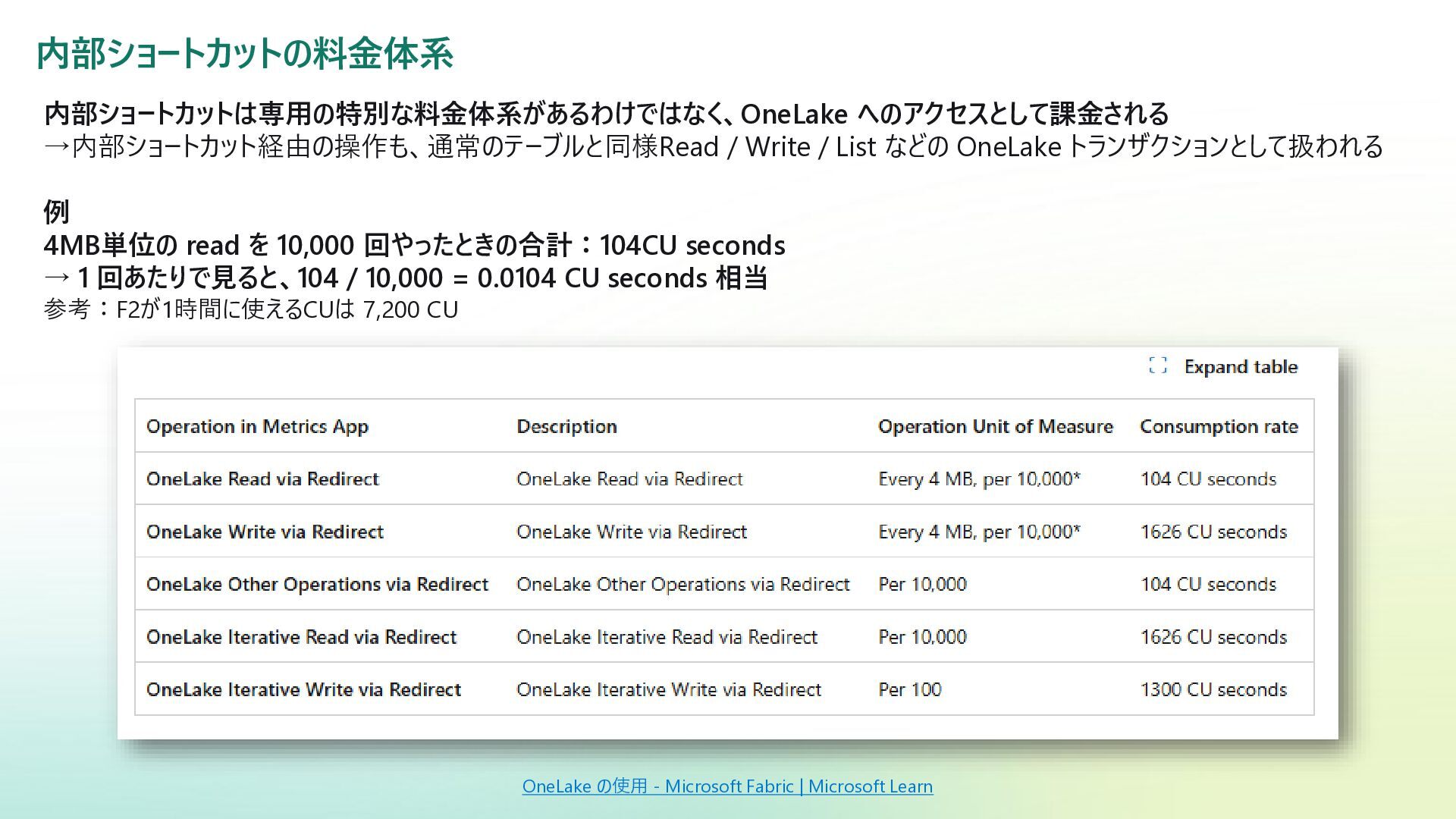 例 4MB単位の read を 10,000 回やったときの合計:104CU seconds → 1 回あたりで見ると、104 / 10,000 = 0.0104 CU seconds 相当 参考:F2が1時間に使えるCUは 7,200 CU 内部ショートカットの料金体系 OneLake の使用 - Microsoft Fabric | Microsoft Learn
