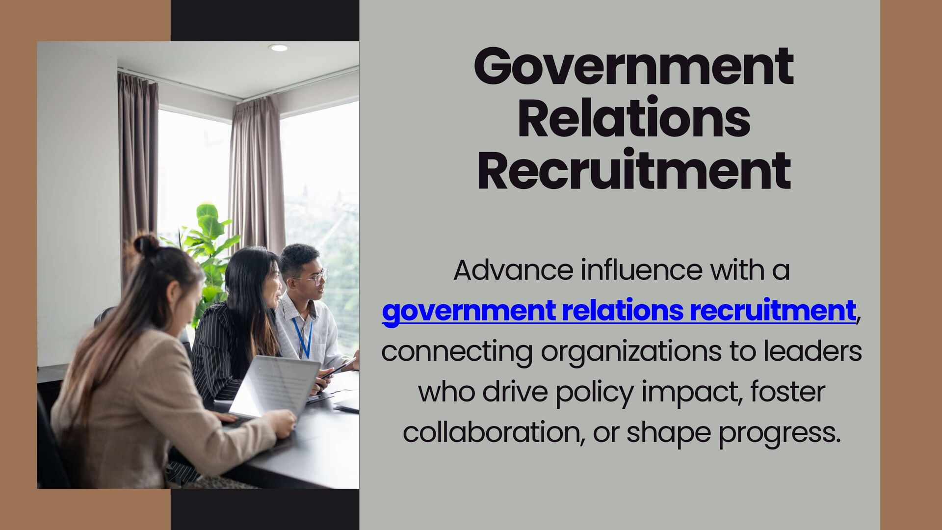 1. Government Relations Recruitment Advance influence with a government relations recruitment,