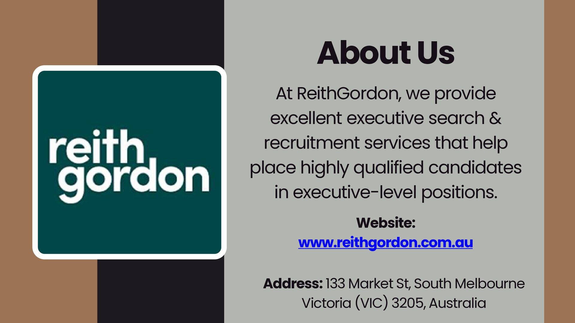 recruitment services that help place highly qualified candidates in executive-level positions. Address: 133 Market St, South Melbourne Victoria (VIC) 3205, Australia Website: www.reithgordon.com.au