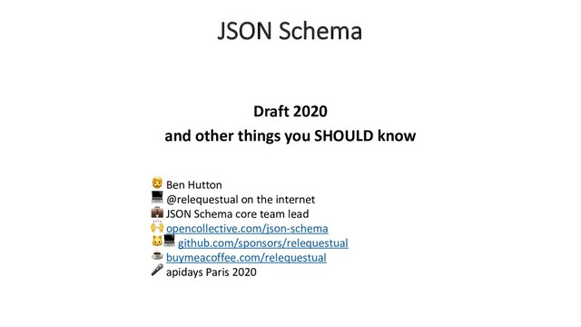 core – jsonschema.dev JSON Schema Draft 2020 and other things you SHOULD know 🧔 Ben Hutton 💻 @relequestual on the internet 💼 JSON Schema core team lead 🙌 opencollective.com/json-schema 🐱💻 github.com/sponsors/relequestual ☕ buymeacoffee.com/relequestual 🎤 apidays Paris 2020