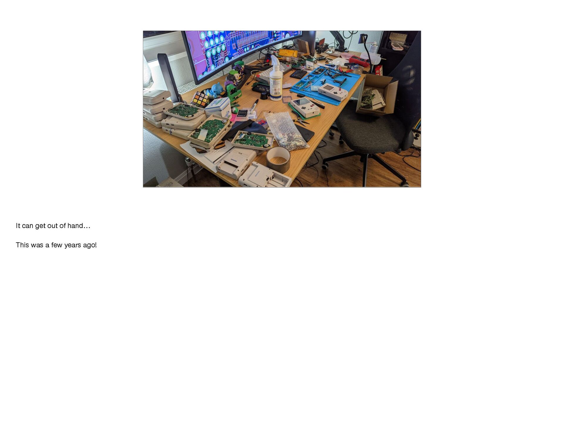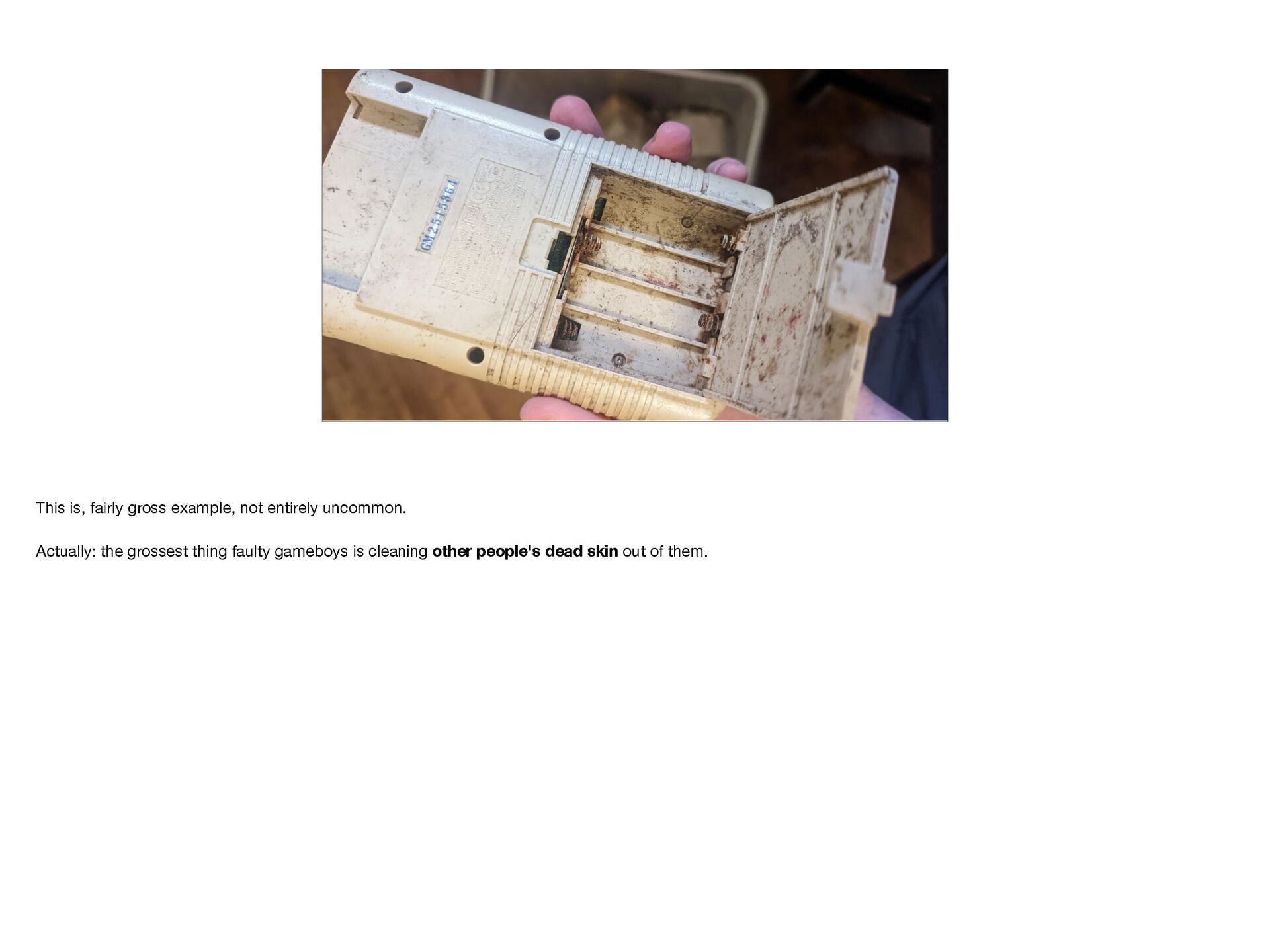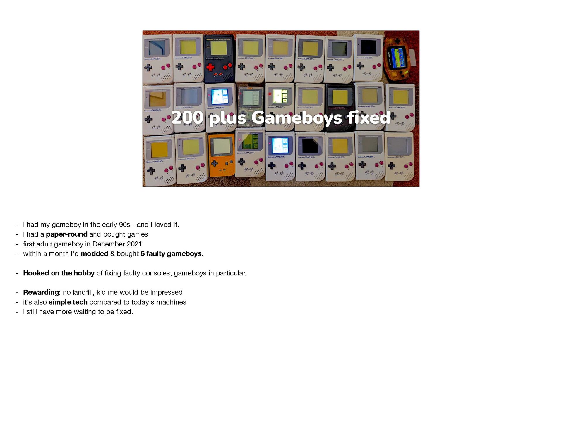 the early 90s - and I loved it. - I had a paper-round and bought games - fi rst adult gameboy in December 2021 - within a month I'd modded & bought 5 faulty gameboys. - Hooked on the hobby of fi xing faulty consoles, gameboys in particular. - Rewarding: no land fi ll, kid me would be impressed - it's also simple tech compared to today's machines - I still have more waiting to be fi xed!