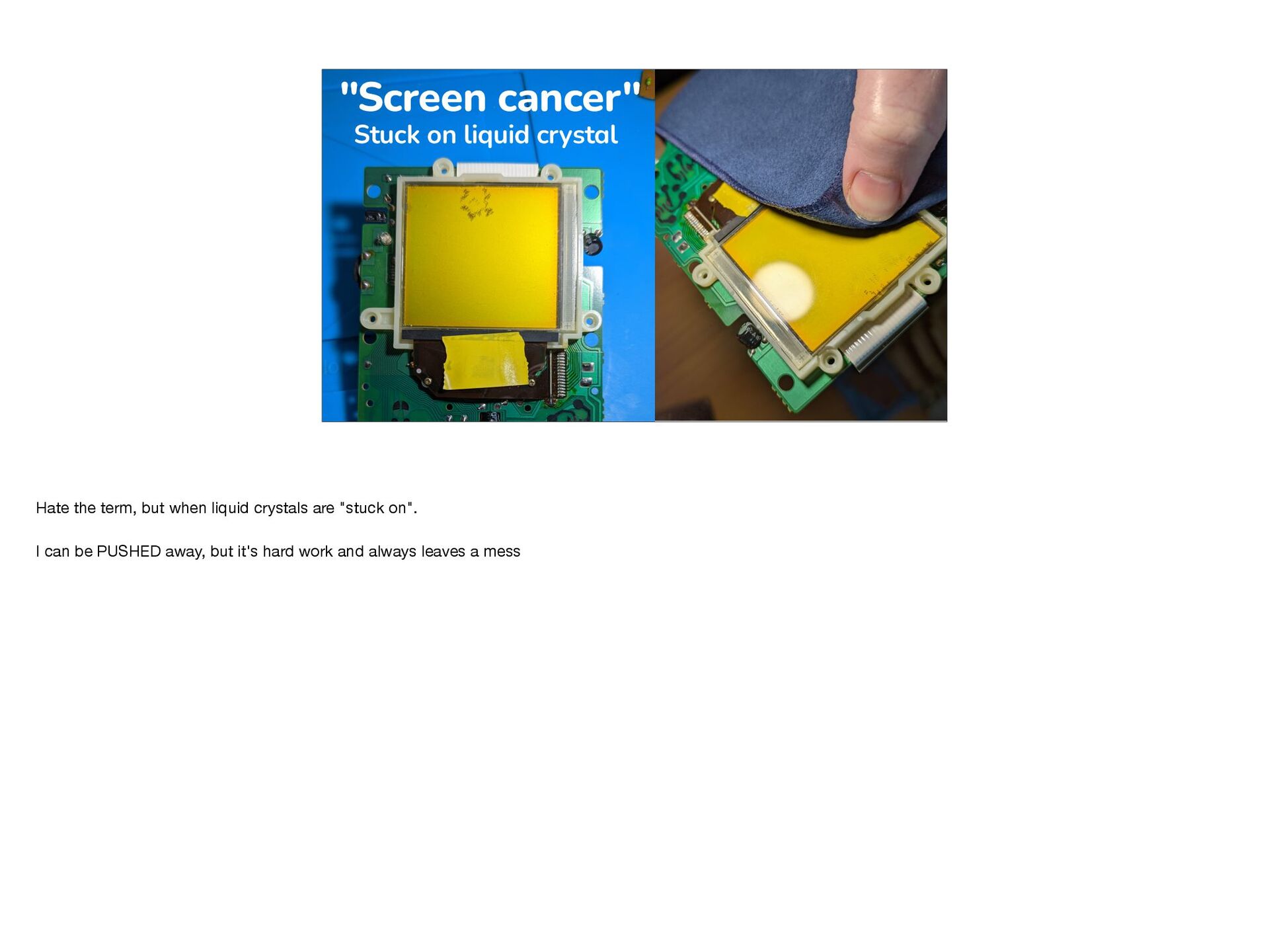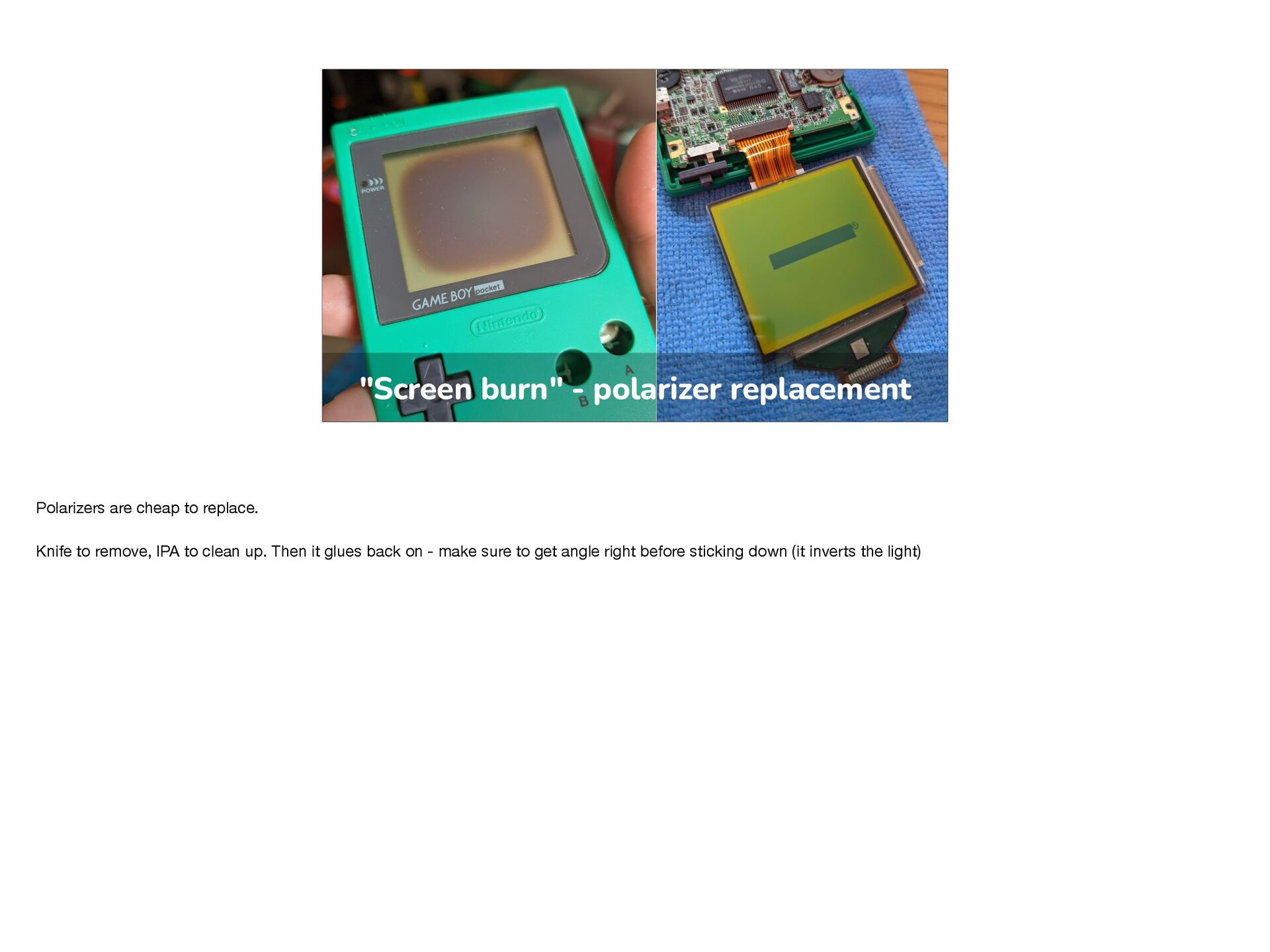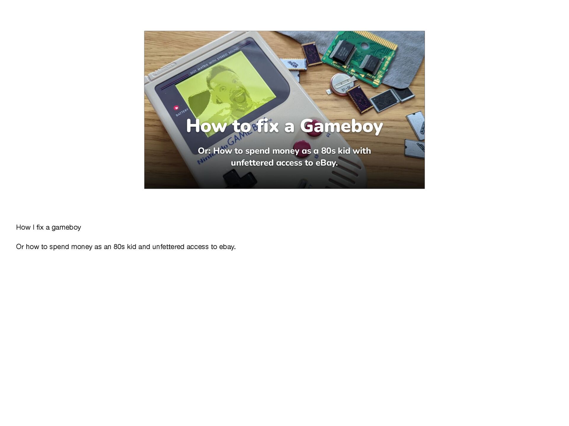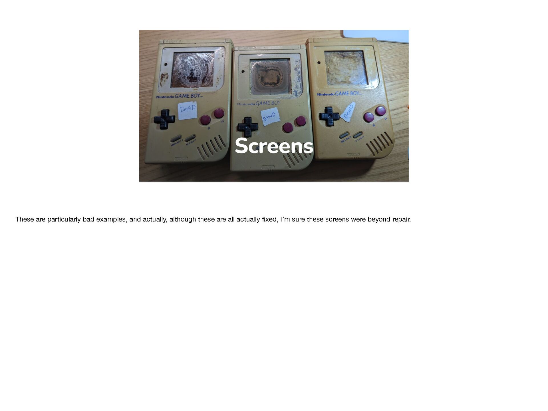 the early 90s - and I loved it. - I had a paper-round and bought games - fi rst adult gameboy in December 2021 - within a month I'd modded & bought 5 faulty gameboys. - Hooked on the hobby of fi xing faulty consoles, gameboys in particular. - Rewarding: no land fi ll, kid me would be impressed - it's also simple tech compared to today's machines - I still have more waiting to be fi xed!