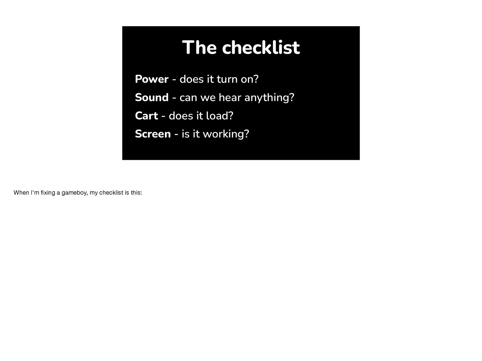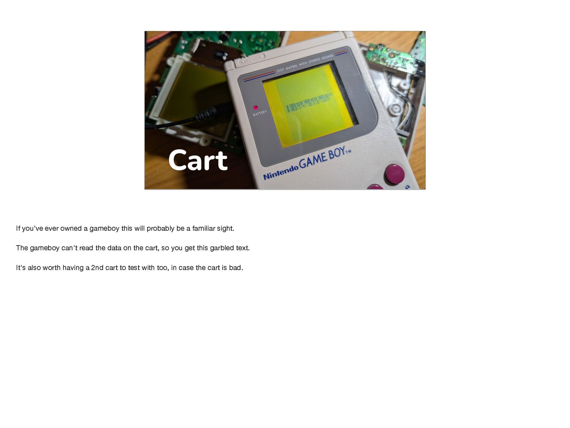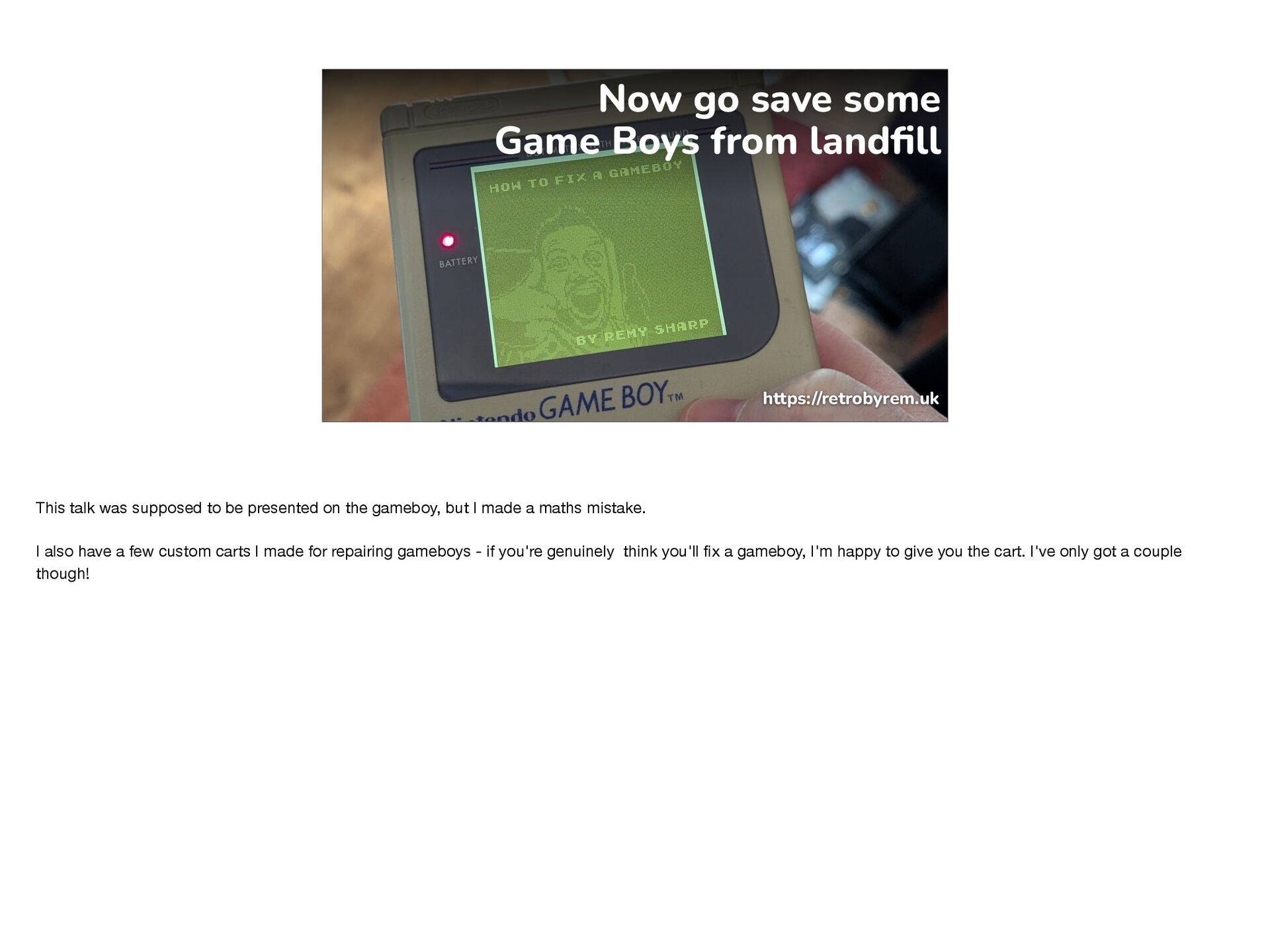 This talk was supposed to be presented on the gameboy, but I made a maths mistake. I also have a few custom carts I made for repairing gameboys - if you're genuinely think you'll fi x a gameboy, I'm happy to give you the cart. I've only got a couple though!