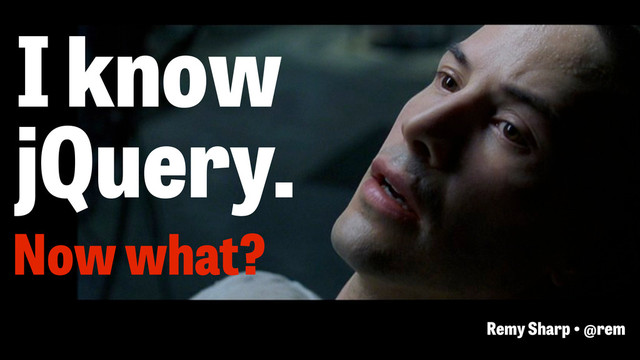 I've always been a big believer in using jQuery as a shortcut route to adding interactivity to web sites. You don't need to know the intricacies of browsers bugs around the DOM. But now you've got that essential jQuery knowledge, what's next? How do you live without jQuery? Are we even there yet? And what about your colleagues and peers - how do they progress with you?