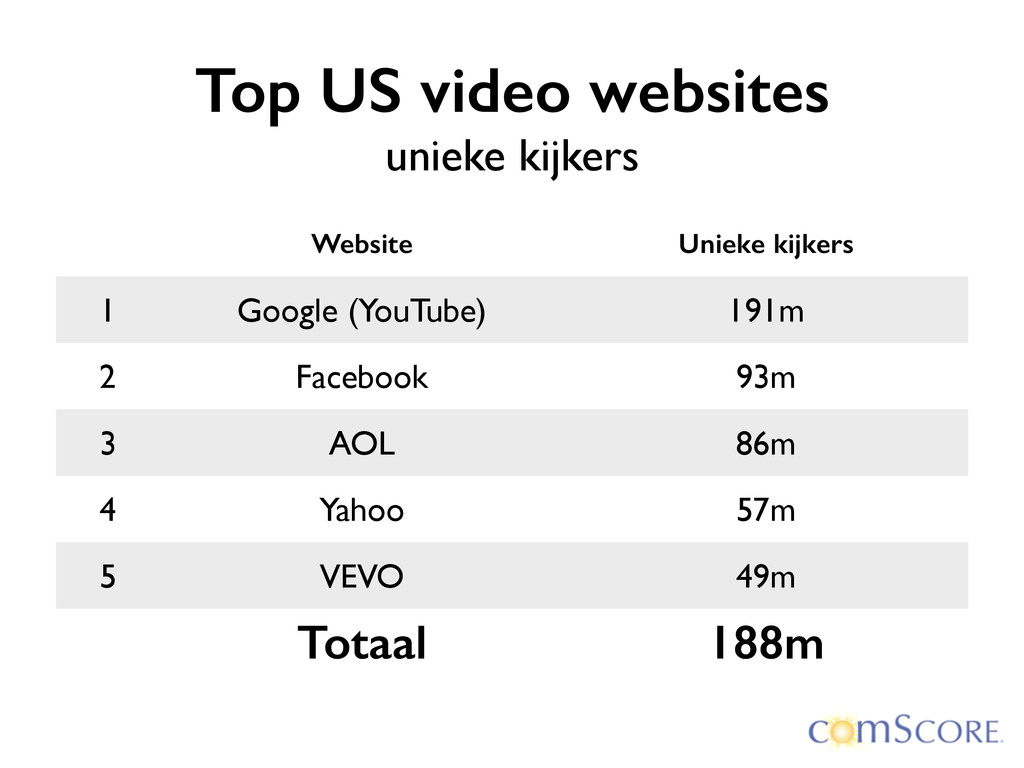 Google (YouTube) 191m 2 Facebook 93m 3 AOL 86m 4 Yahoo 57m 5 VEVO 49m Totaal 188m