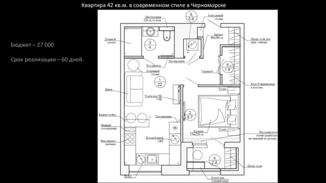 не так много времени проводит дома. При этом она очень ценит комфорт и отдает предпочтение минимализму в интерьере. Для цветового решения мы договорились о монохромной гамме. Подобные интерьеры являются весьма непростыми при создании, зато результаты смотрятся очень графично и объемно за счёт полутонов. О планировочном решении: Решение Застройщика предполагает свободную планировку. Мокрые зоны определены и не подлежат переносу. Базовая планировка предполагала следующие помещения: жилая комната, кухня, ванная комната, санузел. Пожеланиям Заказчицы такая планировка не соответствовала, и мы предложили свое видение: выделили отдельную спальню и сделали кухню — гостиную. В прихожей мы расположили гардеробную комнату, ванную комнату объединили с санузлом, а на месте, где был изначально выделен санузел, сделали постирочную. Кухонный гарнитур расположили вдоль окна, комнату зонировали таким образом, чтобы у нас получилось отдельная зона готовки и отдельная мини-гостиная. В гостиную удалось вписать даже раскладной диван, на случай размещения гостей или родственников. В этом интерьере нет типичного обеденного стола. Решено ограничиться барной стойкой, которая помимо прямого назначения служит еще и дополнительным разделителем зон. В качестве дополнения для барной стойки мы расположили небольшой стол рядом с диваном. Его диаметр 60 см, а высота 74 см, как у стандартного обеденного стола. Спальня в квартире небольшая и является комнатой преимущественно для сна. Из спальни есть выход на балкон, где можно отдохнуть и полюбоваться видами или просто почитать. Отделочные материалы: покрытие пола — ламинат, стены и потолок — краска, ванная комната -керамическая плитка.