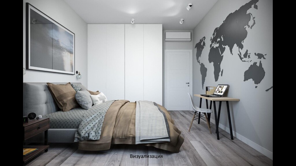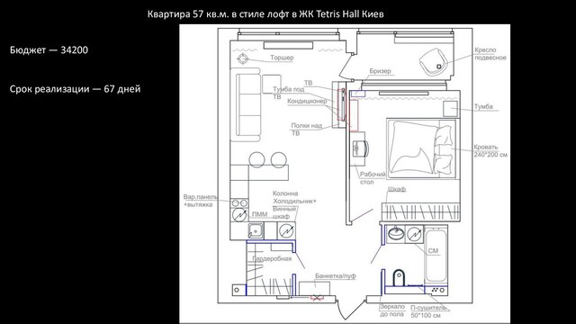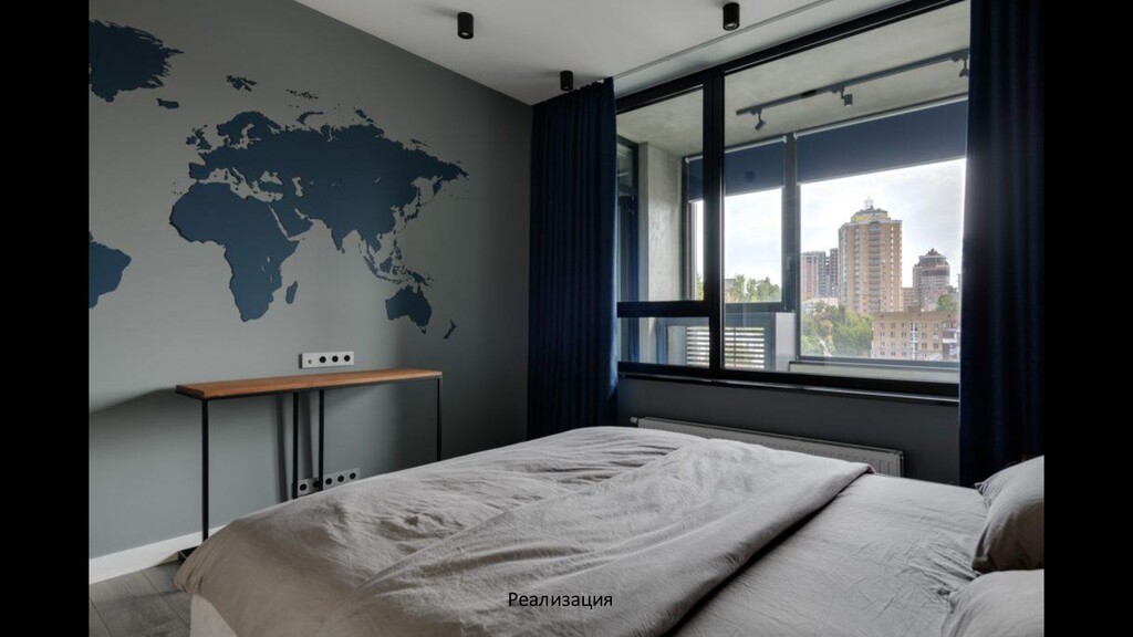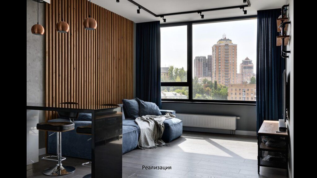 во время непродолжительных, но частых поездок в Киев. Проект выполнен в индустриальном стиле. Задачей было создать простой и комфортный для жизни интерьер. Отделка стен краска, декоративные панели под бетон, деревянные рейки. Потолок остался железобетонный практически во всех помещениях, в спальне запроектирован потолок из ГКЛ, в ванной комнате натяжной потолок. Освещение — направленные споты на шине, точечные светильники, бра. Цветовое решение — серые оттенки, в качестве акцента синий и коричневый цвета.