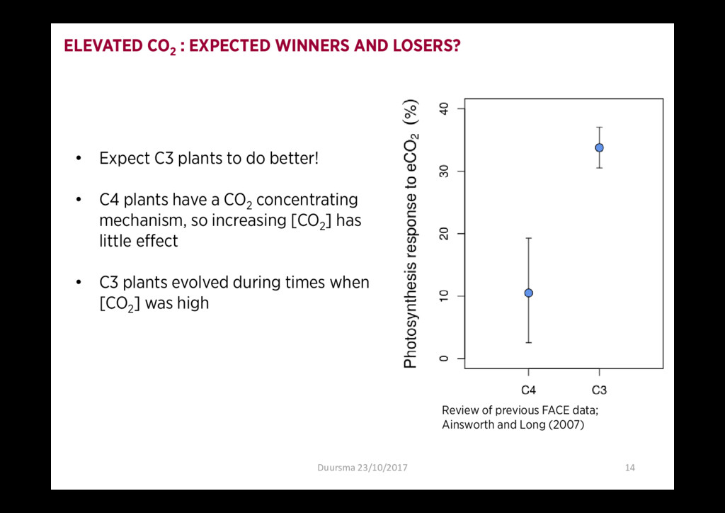 • C4 plants have a CO2 concentrating mechanism, so increasing [CO2 ] has little effect • C3 plants evolved during times when [CO2 ] was high Review of previous FACE data; Ainsworth and Long (2007) ELEVATED CO2 : EXPECTED WINNERS AND LOSERS?