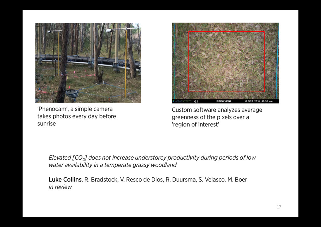 periods of low water availability in a temperate grassy woodland Luke Collins, R. Bradstock, V. Resco de Dios, R. Duursma, S. Velasco, M. Boer in review Custom software analyzes average greenness of the pixels over a 'region of interest' 'Phenocam', a simple camera takes photos every day before sunrise