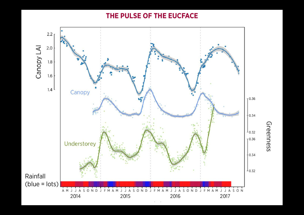 sensors below canopy in each FACE ring, one above (each ring) • Estimate LAI from transmittance (below canopy / above canopy PAR) Canopy leaf area of a mature evergreen Eucalyptus woodland does not respond to elevated atmospheric [CO2 ] but tracks water availability Remko Duursma, T. Gimeno, M. Boer, K. Crous, M. Tjoelker, D. Ellsworth Global Change Biology, 2016
