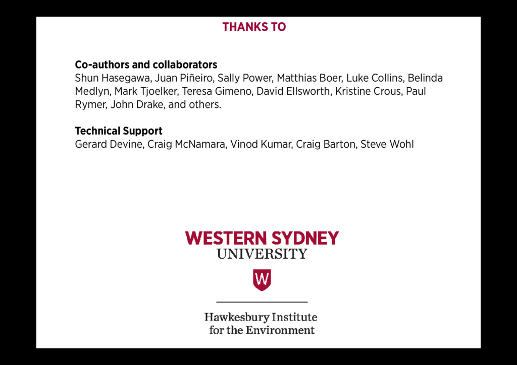 Power, Matthias Boer, Luke Collins, Belinda Medlyn, Mark Tjoelker, Teresa Gimeno, David Ellsworth, Kristine Crous, Paul Rymer, John Drake, and others. Technical Support Gerard Devine, Craig McNamara, Vinod Kumar, Craig Barton, Steve Wohl