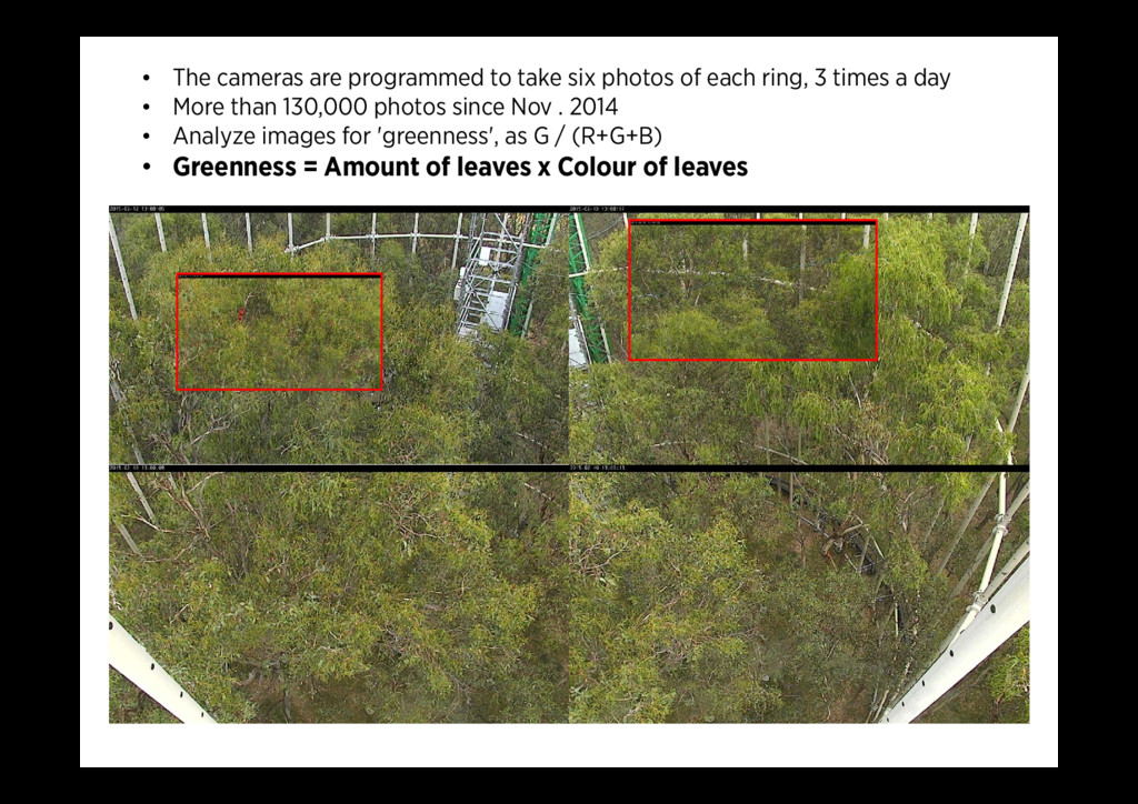each ring, 3 times a day • More than 130,000 photos since Nov . 2014 • Analyze images for 'greenness', as G / (R+G+B) • Greenness = Amount of leaves x Colour of leaves