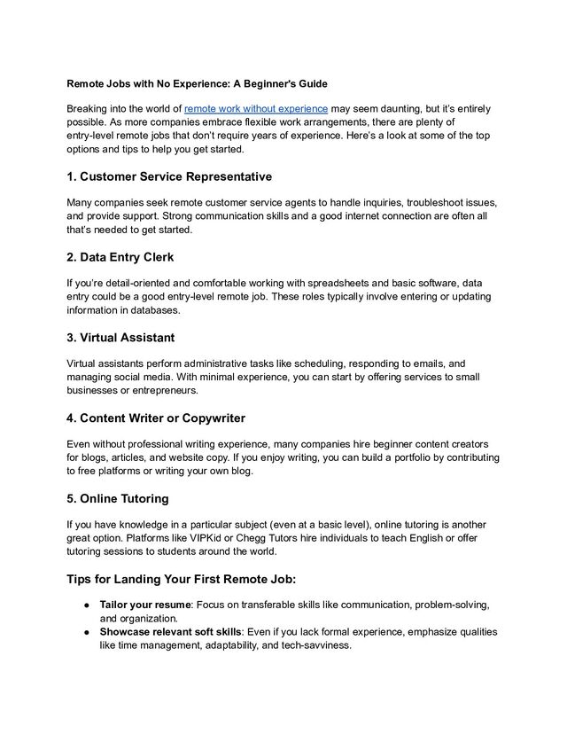 the world of remote work without experience may seem daunting, but it’s entirely possible. As more companies embrace flexible work arrangements, there are plenty of entry-level remote jobs that don’t require years of experience. Here’s a look at some of the top options and tips to help you get started. 1. Customer Service Representative Many companies seek remote customer service agents to handle inquiries, troubleshoot issues, and provide support. Strong communication skills and a good internet connection are often all that’s needed to get started. 2. Data Entry Clerk If you’re detail-oriented and comfortable working with spreadsheets and basic software, data entry could be a good entry-level remote job. These roles typically involve entering or updating information in databases. 3. Virtual Assistant Virtual assistants perform administrative tasks like scheduling, responding to emails, and managing social media. With minimal experience, you can start by offering services to small businesses or entrepreneurs. 4. Content Writer or Copywriter Even without professional writing experience, many companies hire beginner content creators for blogs, articles, and website copy. If you enjoy writing, you can build a portfolio by contributing to free platforms or writing your own blog. 5. Online Tutoring If you have knowledge in a particular subject (even at a basic level), online tutoring is another great option. Platforms like VIPKid or Chegg Tutors hire individuals to teach English or offer tutoring sessions to students around the world. Tips for Landing Your First Remote Job: • Tailor your resume: Focus on transferable skills like communication, problem-solving, and organization. • Showcase relevant soft skills: Even if you lack formal experience, emphasize qualities like time management, adaptability, and tech-savviness.
