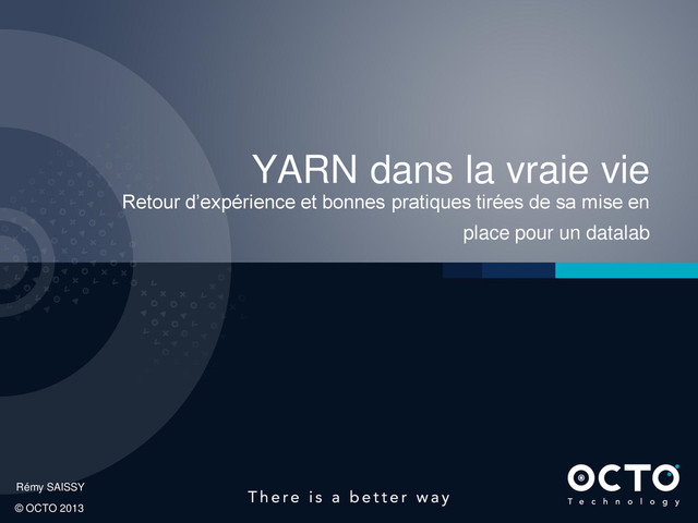 cluster Les paramètres dépendent de votre utilisation Comment l’éviter ? Compresser les résultats intermédiaires avec Snappy Utiliser le CapacityScheduler ou le FairScheduler Indiquer à YARN des valeurs mémoire minimales et maximales larges Configurer avec des règles de calcul Container / serveur : nb cores * 1,5 – 1 Mémoire : 8Go / core Auditer l’usage réel pour optimiser les configurations Conserver la configuration par défaut de MapReduce