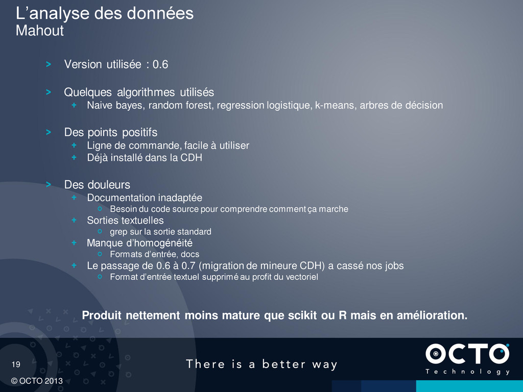 utilisés Naive bayes, random forest, regression logistique, k-means, arbres de décision Des points positifs Ligne de commande, facile à utiliser Déjà installé dans la CDH Des douleurs Documentation inadaptée Besoin du code source pour comprendre comment ça marche Sorties textuelles grep sur la sortie standard Manque d’homogénéité Formats d’entrée, docs Le passage de 0.6 à 0.7 (migration de mineure CDH) a cassé nos jobs Format d’entrée textuel supprimé au profit du vectoriel Produit nettement moins mature que scikit ou R mais en amélioration. L’analyse des données Mahout