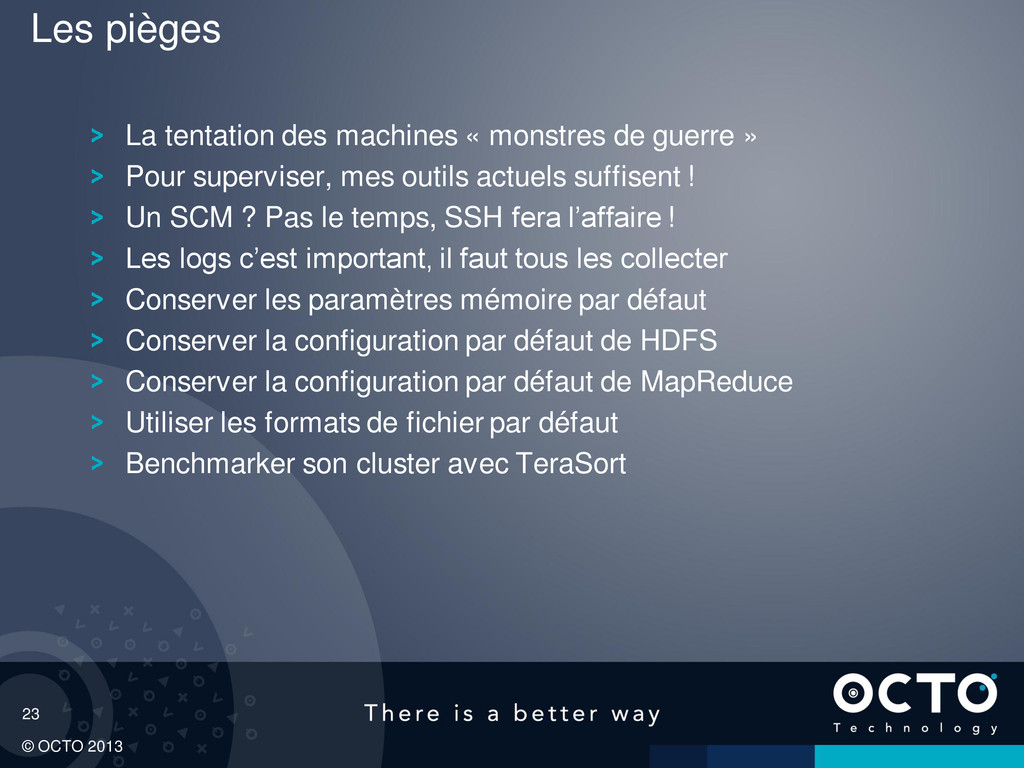 de guerre » Pour superviser, mes outils actuels suffisent ! Un SCM ? Pas le temps, SSH fera l’affaire ! Les logs c’est important, il faut tous les collecter Conserver les paramètres mémoire par défaut Conserver la configuration par défaut de HDFS Conserver la configuration par défaut de MapReduce Utiliser les formats de fichier par défaut Benchmarker son cluster avec TeraSort Les pièges