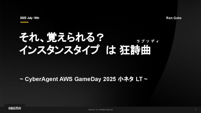 1 それ、覚えられる? インスタンスタイプ は 狂詩曲 2025 July 16th ~ CyberAgent AWS GameDay 2025 小ネタ LT ~ Ren Goto ラ プ ソ デ ィ